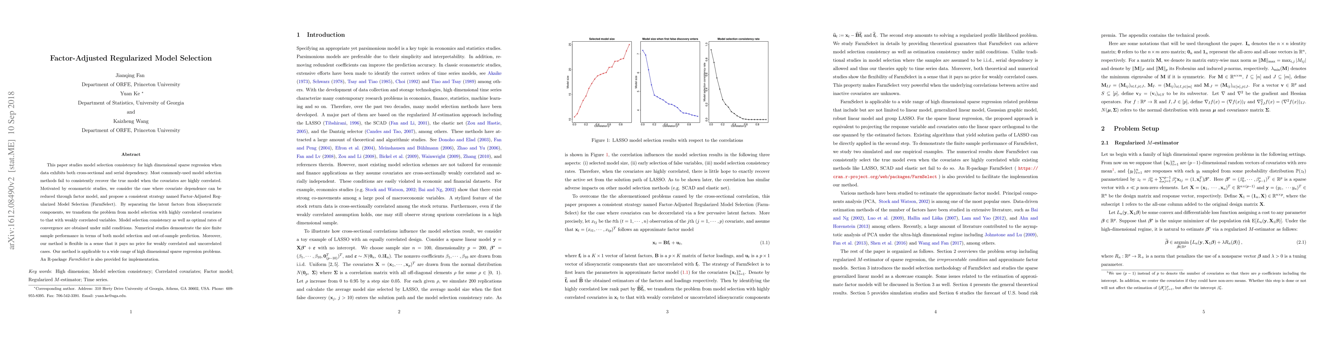 This paper studies model selection consistency for high dimensional sparse regression when data exhibits both cross-sectional and serial dependency. Most commonly-used model selection methods fail to consistently recover the true model when the covariates are highly correlated. Motivated by econometric studies, we consider the case where covariate dependence can be reduced through factor model, and propose a consistent strategy named Factor-Adjusted Regularized Model Selection (FarmSelect). By separating the latent factors from idiosyncratic components, we transform the problem from model selection with highly correlated covariates to that with weakly correlated variables. Model selection consistency as well as optimal rates of convergence are obtained under mild conditions. Numerical studies demonstrate the nice finite sample performance in terms of both model selection and out-of-sample prediction. Moreover, our method is flexible in a sense that it pays no price for weakly correlated and uncorrelated cases. Our method is applicable to a wide range of high dimensional sparse regression problems. An R-package FarmSelect is also provided for implementation.