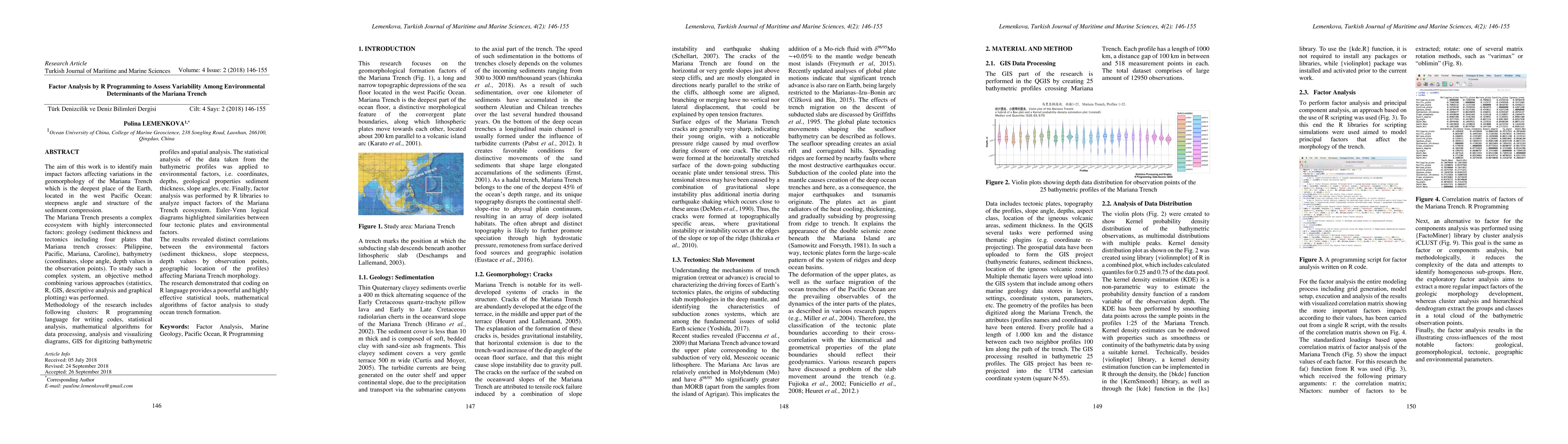 The aim of this work is to identify main impact factors affecting variations in the geomorphology of the Mariana Trench which is the deepest place of the Earth, located in the west Pacific Ocean: steepness angle and structure of the sediment compression. The Mariana Trench presents a complex ecosystem with highly interconnected factors: geology (sediment thickness and tectonics including four plates that Mariana trench crosses: Philippine, Pacific, Mariana, Caroline), bathymetry (coordinates, slope angle, depth values in the observation points). To study such a complex system, an objective method combining various approaches (statistics, R, GIS, descriptive analysis and graphical plotting) was performed. Methodology of the research includes following clusters: R programming language for writing codes, statistical analysis, mathematical algorithms for data processing, analysis and visualizing diagrams, GIS for digitizing bathymetric profiles and spatial analysis. The statistical analysis of the data taken from the bathymetric profiles was applied to environmental factors, i.e. coordinates, depths, geological properties sediment thickness, slope angles, etc. Finally, factor analysis was performed by R libraries to analyze impact factors of the Mariana Trench ecosystem. Euler-Venn logical diagrams highlighted similarities between four tectonic plates and environmental factors. The results revealed distinct correlations between the environmental factors (sediment thickness, slope steepness, depth values by observation points, geographic location of the profiles) affecting Mariana Trench morphology. The research demonstrated that coding on R language provides a powerful and highly effective statistical tools, mathematical algorithms of factor analysis to study ocean trench formation.