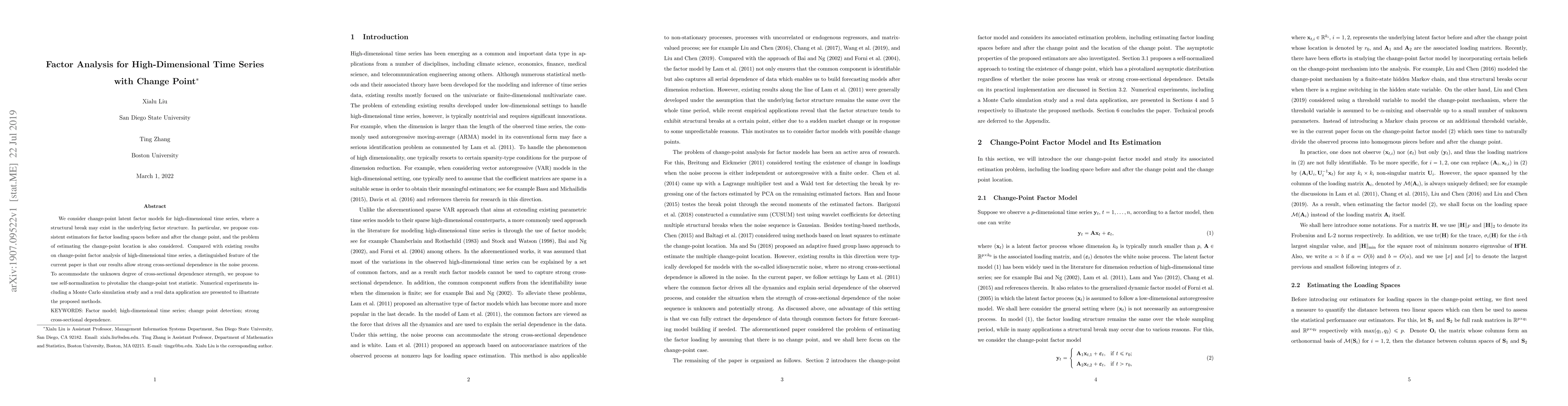 This paper proposes consistent estimators for factor loading spaces in high-dimensional time series with potential change points, allowing for strong cross-sectional dependence. It introduces self-normalization techniques to handle unknown cross-sectional dependence and demonstrates the methods through Monte Carlo simulations and real data applications.