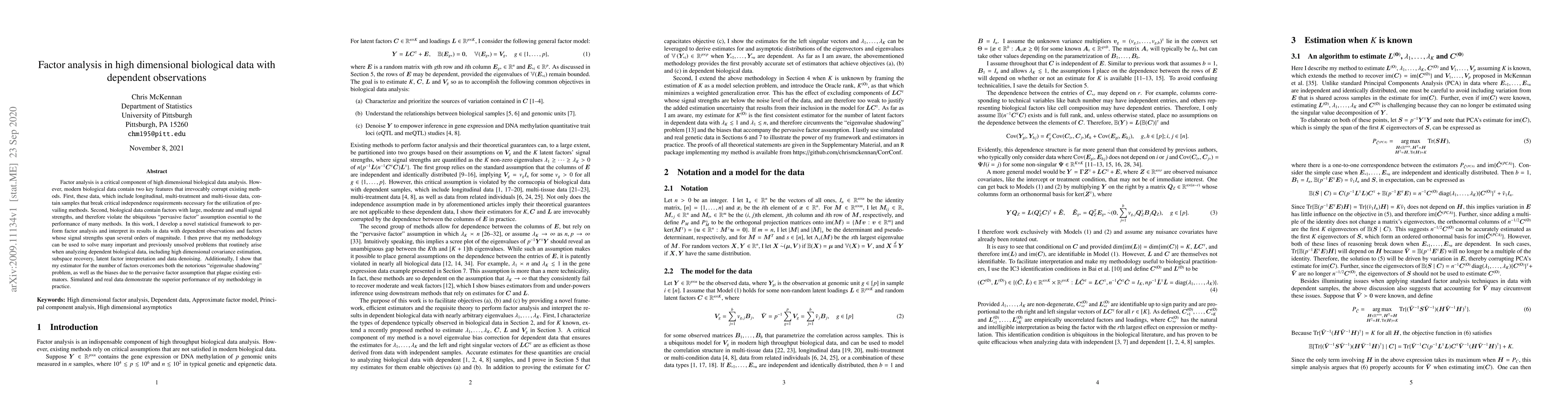 This paper introduces a novel statistical framework for factor analysis in high-dimensional biological data, addressing the challenges of dependent observations and varying signal strengths. The proposed methodology outperforms existing methods in solving complex problems like covariance estimation and latent factor interpretation, demonstrating superior performance through simulations and real data analysis.