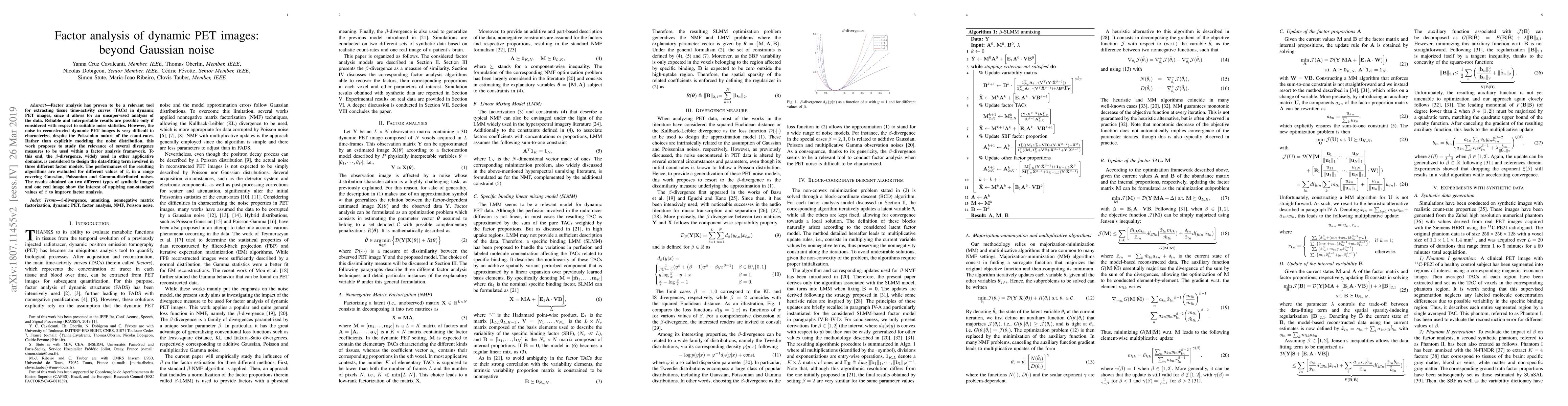 This paper explores the use of $\beta$-divergence measures in factor analysis for dynamic PET images, proposing an alternative to traditional Gaussian noise modeling. The study evaluates various $\beta$ values to enhance factor analysis, demonstrating improved results for non-standard $\beta$ values across synthetic and real PET image data.