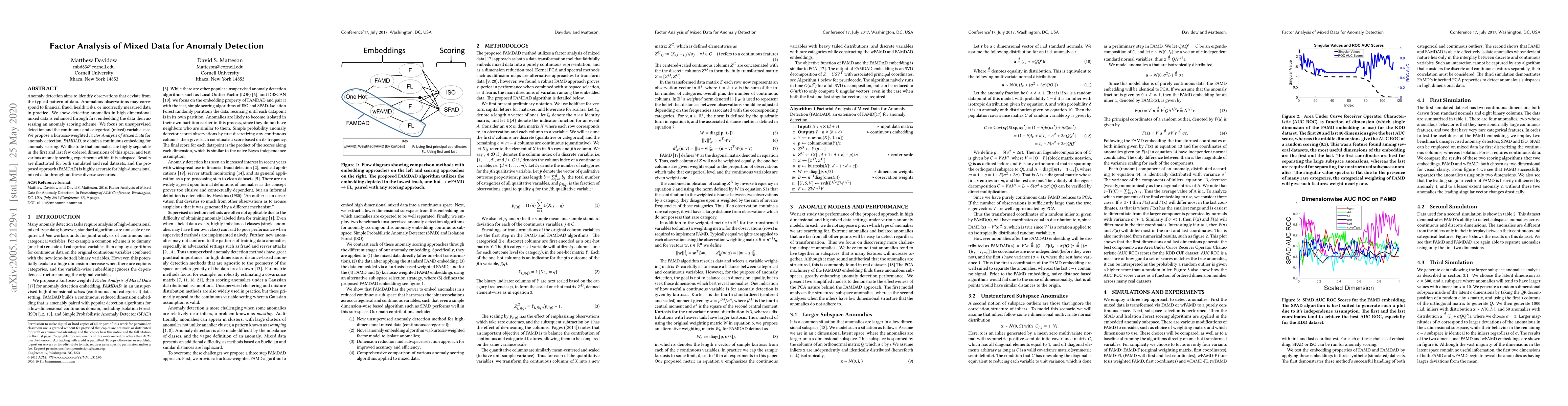 Anomaly detection aims to identify observations that deviate from the typical pattern of data. Anomalous observations may correspond to financial fraud, health risks, or incorrectly measured data in practice. We show detecting anomalies in high-dimensional mixed data is enhanced through first embedding the data then assessing an anomaly scoring scheme. We focus on unsupervised detection and the continuous and categorical (mixed) variable case. We propose a kurtosis-weighted Factor Analysis of Mixed Data for anomaly detection, FAMDAD, to obtain a continuous embedding for anomaly scoring. We illustrate that anomalies are highly separable in the first and last few ordered dimensions of this space, and test various anomaly scoring experiments within this subspace. Results are illustrated for both simulated and real datasets, and the proposed approach (FAMDAD) is highly accurate for high-dimensional mixed data throughout these diverse scenarios.