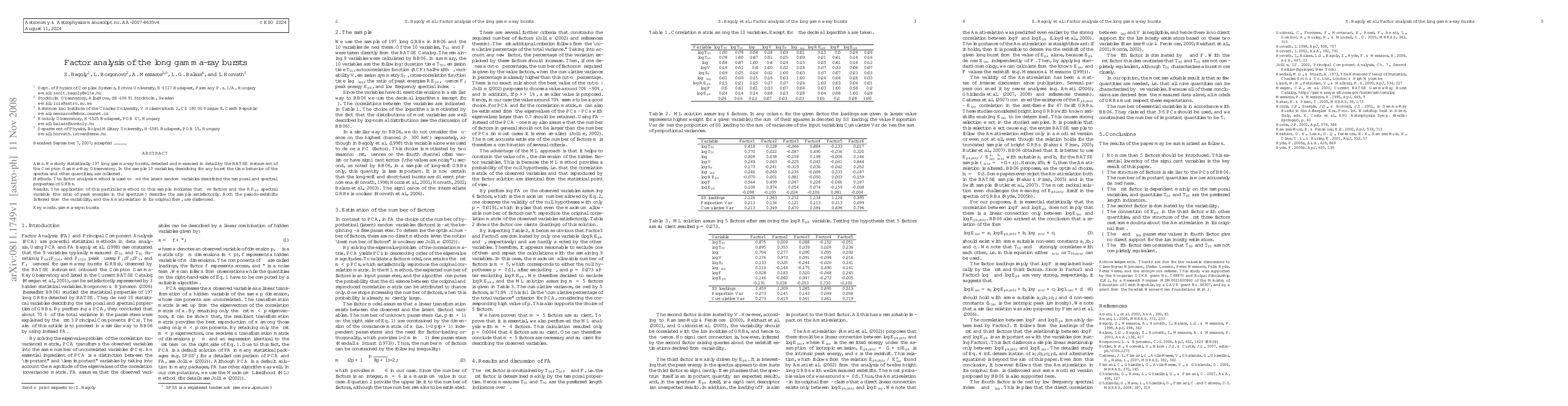 This study employs factor analysis on 197 long gamma-ray bursts to identify latent variables describing their temporal and spectral characteristics, concluding that five factors and the $\REpk$ spectral variable provide a satisfactory description. The analysis disfavors pseudo-redshifts and the original Amati-relation.