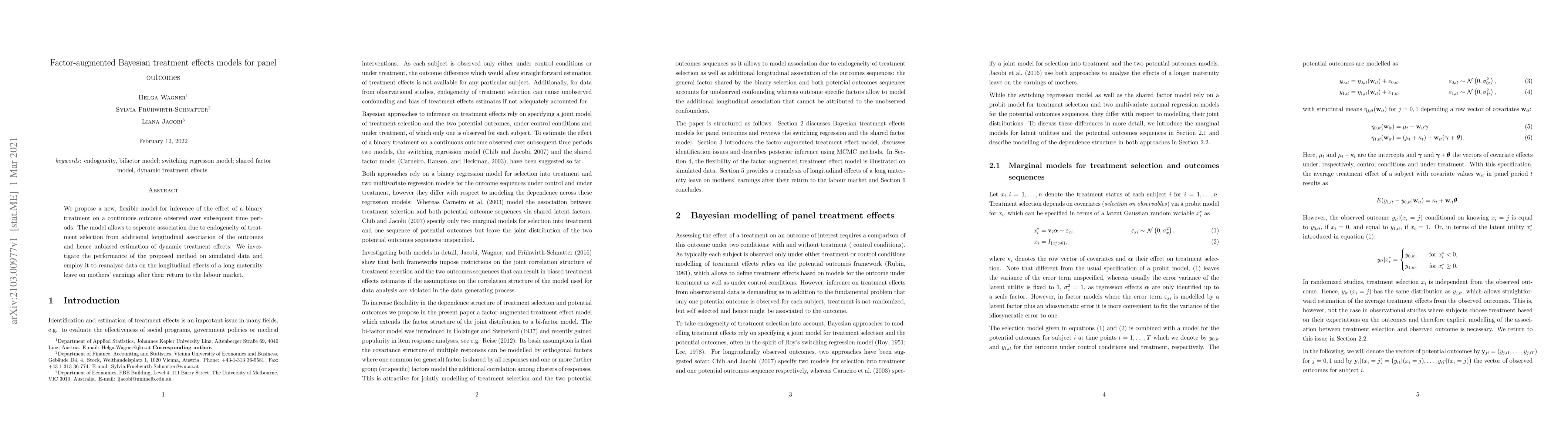 We propose a new, flexible model for inference of the effect of a binary treatment on a continuous outcome observed over subsequent time periods. The model allows to seperate association due to endogeneity of treatment selection from additional longitudinal association of the outcomes and hence unbiased estimation of dynamic treatment effects. We investigate the performance of the proposed method on simulated data and employ it to reanalyse data on the longitudinal effects of a long maternity leave on mothers' earnings after their return to the labour market.