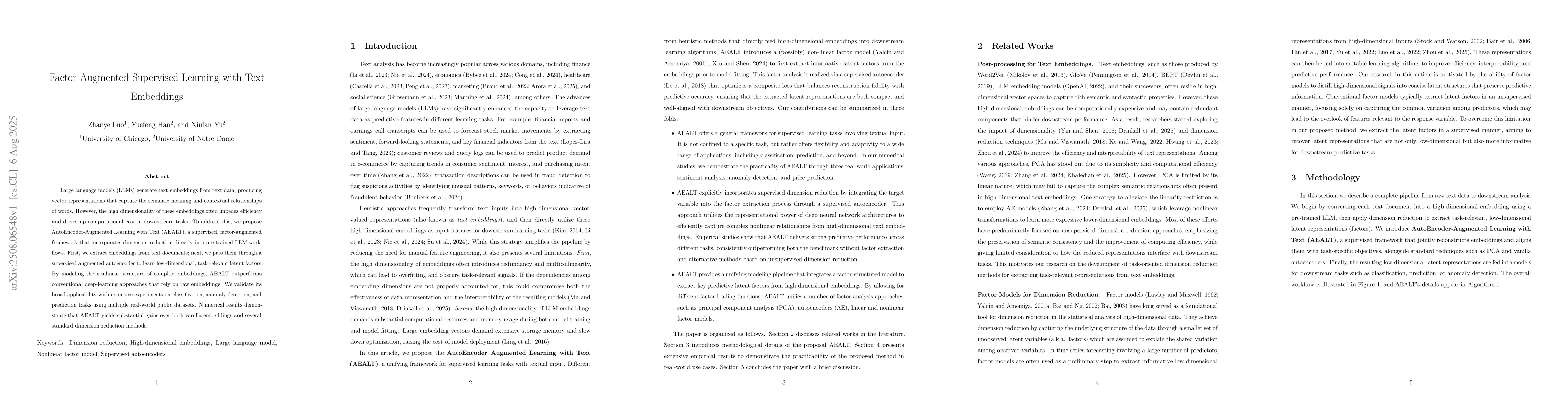 Large language models (LLMs) generate text embeddings from text data, producing vector representations that capture the semantic meaning and contextual relationships of words. However, the high dimensionality of these embeddings often impedes efficiency and drives up computational cost in downstream tasks. To address this, we propose AutoEncoder-Augmented Learning with Text (AEALT), a supervised, factor-augmented framework that incorporates dimension reduction directly into pre-trained LLM workflows. First, we extract embeddings from text documents; next, we pass them through a supervised augmented autoencoder to learn low-dimensional, task-relevant latent factors. By modeling the nonlinear structure of complex embeddings, AEALT outperforms conventional deep-learning approaches that rely on raw embeddings. We validate its broad applicability with extensive experiments on classification, anomaly detection, and prediction tasks using multiple real-world public datasets. Numerical results demonstrate that AEALT yields substantial gains over both vanilla embeddings and several standard dimension reduction methods.