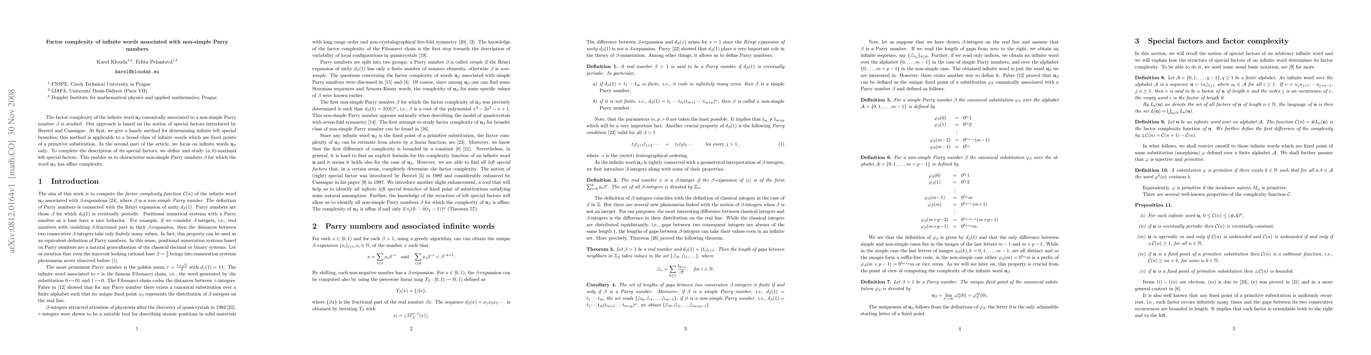 The factor complexity of the infinite word $\ubeta$ canonically associated to a non-simple Parry number $\beta$ is studied. Our approach is based on the notion of special factors introduced by Berstel and Cassaigne. At first, we give a handy method for determining infinite left special branches; this method is applicable to a broad class of infinite words which are fixed points of a primitive substitution. In the second part of the article, we focus on infinite words $\ubeta$ only. To complete the description of its special factors, we define and study $(a,b)$-maximal left special factors. This enables us to characterize non-simple Parry numbers $\beta$ for which the word $\ubeta$ has affine complexity.