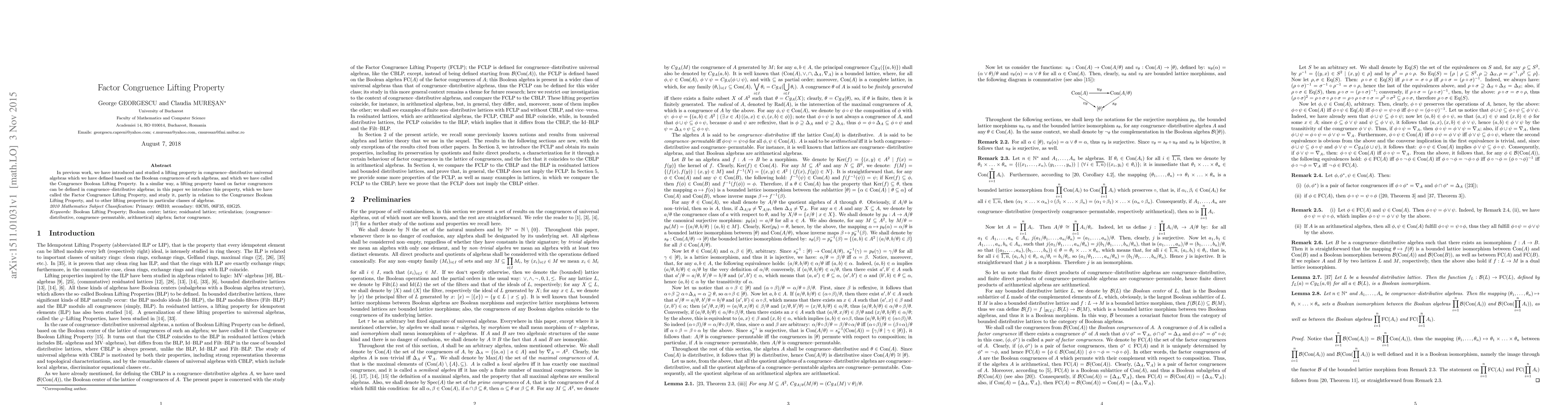 Title: Factor Congruence Lifting Property Abstract: This paper introduces the Factor Congruence Lifting Property in congruence-distributive universal algebras, extending previous work on the Congruence Boolean Lifting Property, and studies its relationship to other lifting properties in specific algebraic classes.