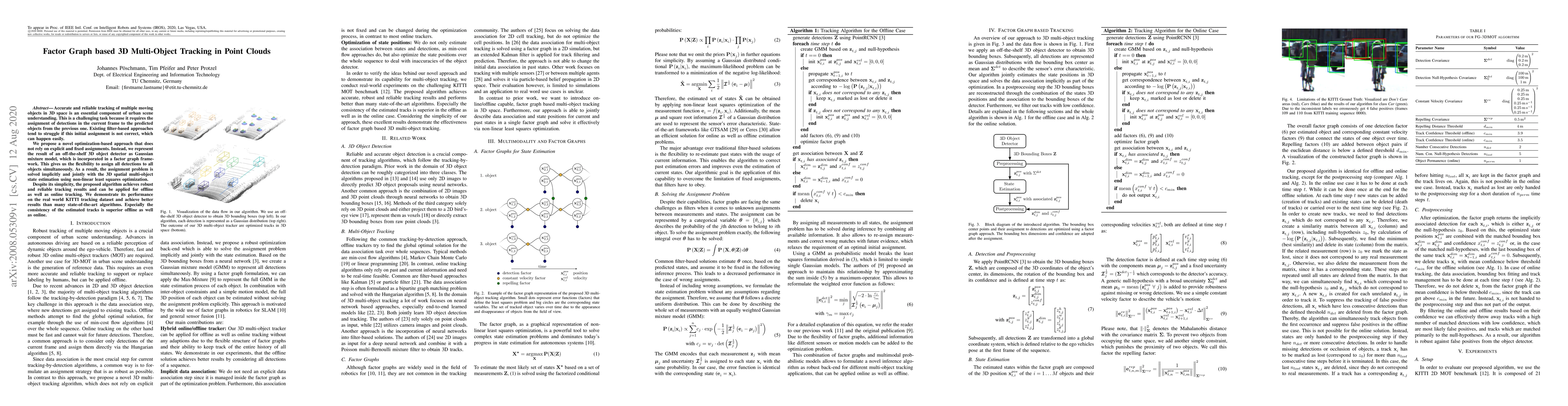 Accurate and reliable tracking of multiple moving objects in 3D space is an essential component of urban scene understanding. This is a challenging task because it requires the assignment of detections in the current frame to the predicted objects from the previous one. Existing filter-based approaches tend to struggle if this initial assignment is not correct, which can happen easily. We propose a novel optimization-based approach that does not rely on explicit and fixed assignments. Instead, we represent the result of an off-the-shelf 3D object detector as Gaussian mixture model, which is incorporated in a factor graph framework. This gives us the flexibility to assign all detections to all objects simultaneously. As a result, the assignment problem is solved implicitly and jointly with the 3D spatial multi-object state estimation using non-linear least squares optimization. Despite its simplicity, the proposed algorithm achieves robust and reliable tracking results and can be applied for offline as well as online tracking. We demonstrate its performance on the real world KITTI tracking dataset and achieve better results than many state-of-the-art algorithms. Especially the consistency of the estimated tracks is superior offline as well as online.
