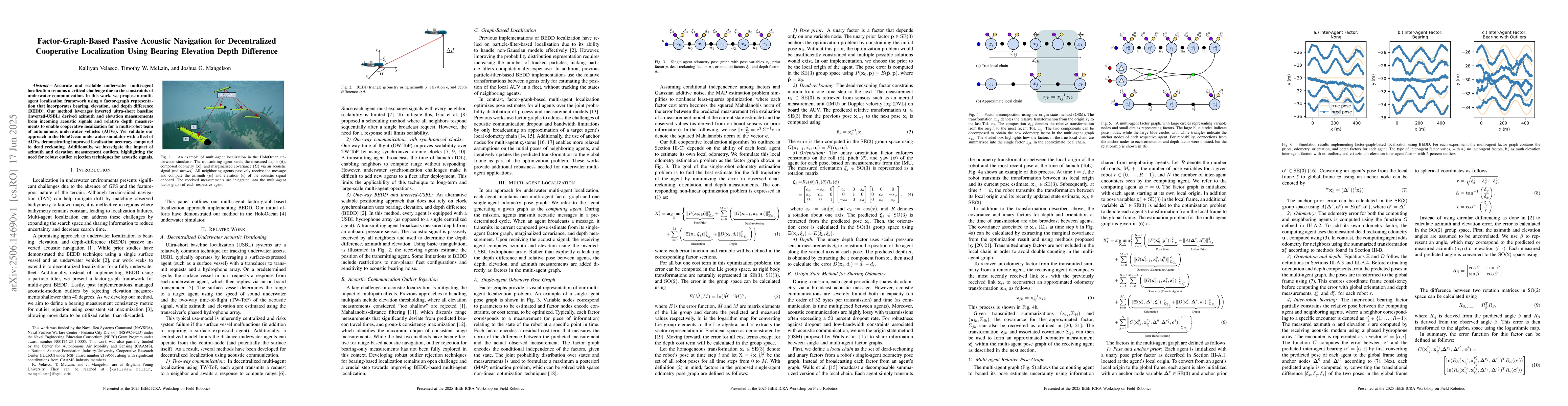 This research presents a novel decentralized localization framework for autonomous underwater vehicles (AUVs) using a factor-graph representation that incorporates bearing, elevation, and depth difference (BEDD) measurements. The method, validated in the HoloOcean underwater simulator, improves localization accuracy over dead reckoning and emphasizes the importance of robust outlier rejection techniques for acoustic signals.