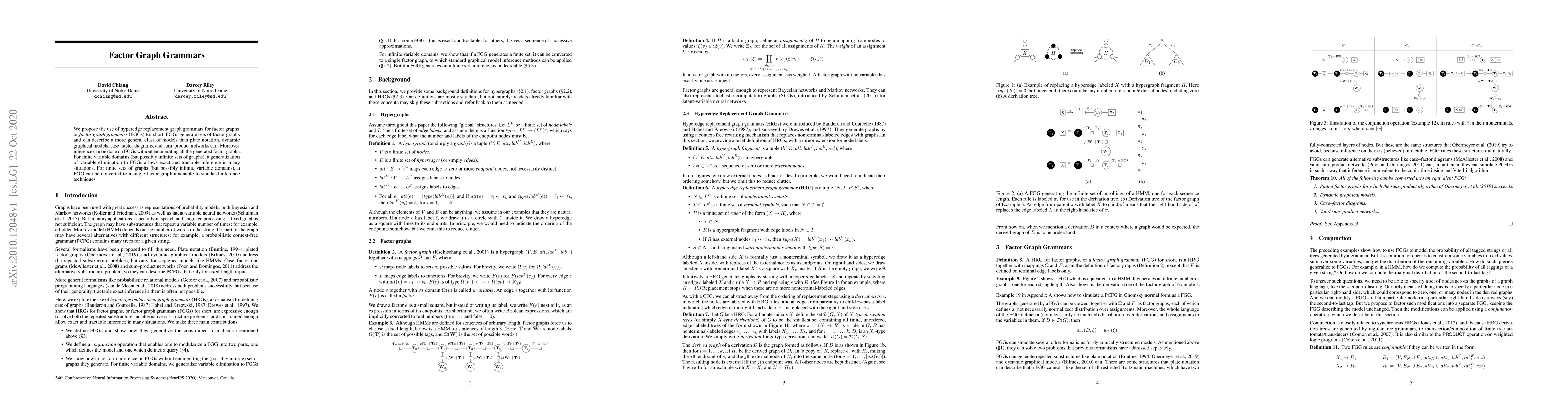 This paper introduces factor graph grammars (FGGs) based on hyperedge replacement graph grammars, which can describe a broader class of models than existing notations. Inference on FGGs is tractable without enumerating all generated factor graphs, enabling exact inference through variable elimination or conversion to a single factor graph for standard techniques.