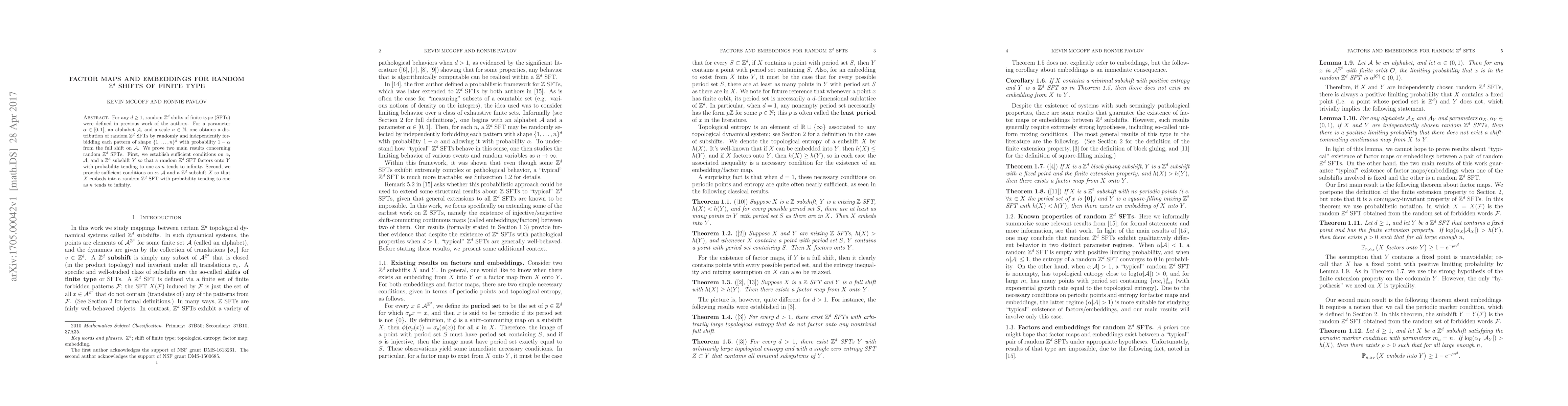 This paper defines random $\mathbb{Z}^d$ shifts of finite type (SFTs) and proves two main results: conditions ensuring that a random $\mathbb{Z}^d$ SFT factors onto a given subshift $Y$ with high probability, and conditions for embedding a given subshift $X$ into a random $\mathbb{Z}^d$ SFT with high probability as the scale increases.