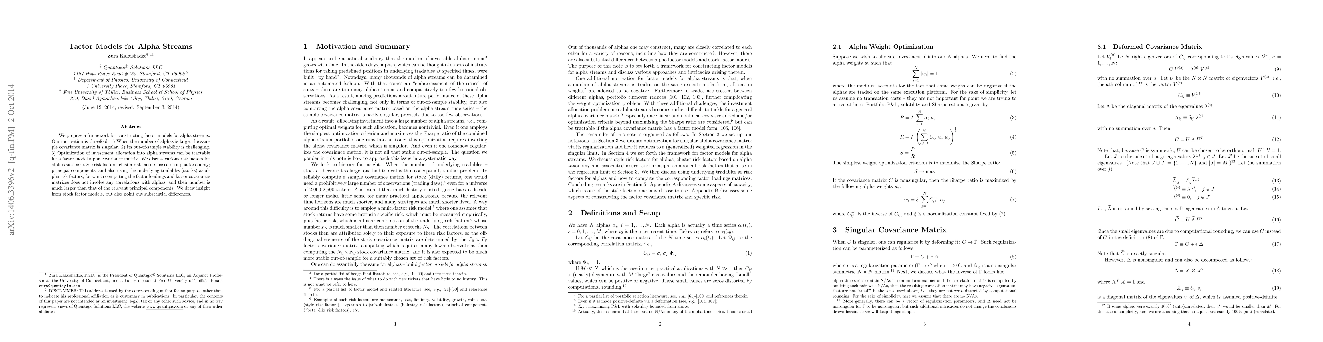 We propose a framework for constructing factor models for alpha streams. Our motivation is threefold. 1) When the number of alphas is large, the sample covariance matrix is singular. 2) Its out-of-sample stability is challenging. 3) Optimization of investment allocation into alpha streams can be tractable for a factor model alpha covariance matrix. We discuss various risk factors for alphas such as: style risk factors; cluster risk factors based on alpha taxonomy; principal components; and also using the underlying tradables (stocks) as alpha risk factors, for which computing the factor loadings and factor covariance matrices does not involve any correlations with alphas, and their number is much larger than that of the relevant principal components. We draw insight from stock factor models, but also point out substantial differences.