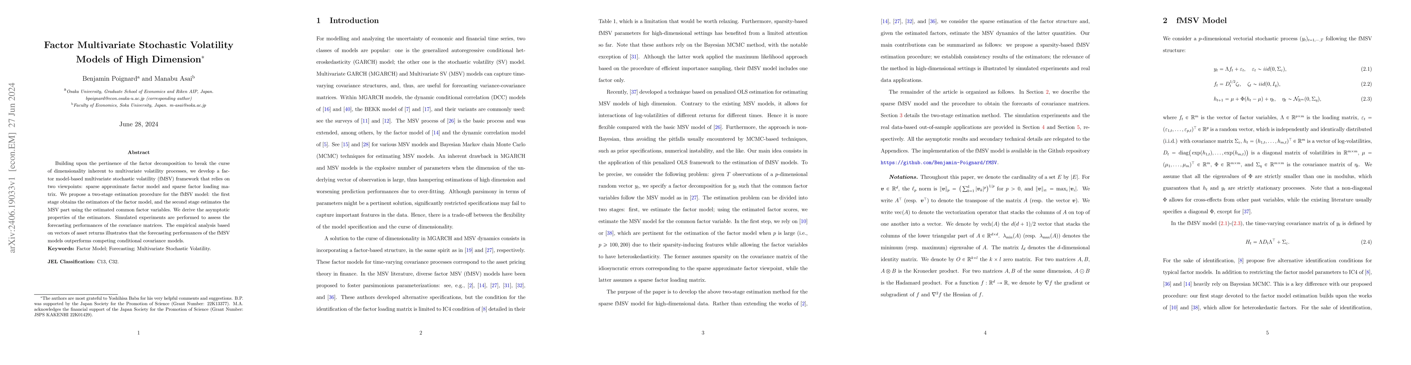 This paper proposes a factor model-based framework to handle high-dimensional multivariate stochastic volatility (fMSV) processes by decomposing them into sparse factor models. The two-stage estimation procedure shows superior forecasting performance over other conditional covariance models, as demonstrated through simulations and empirical analysis on asset return vectors.