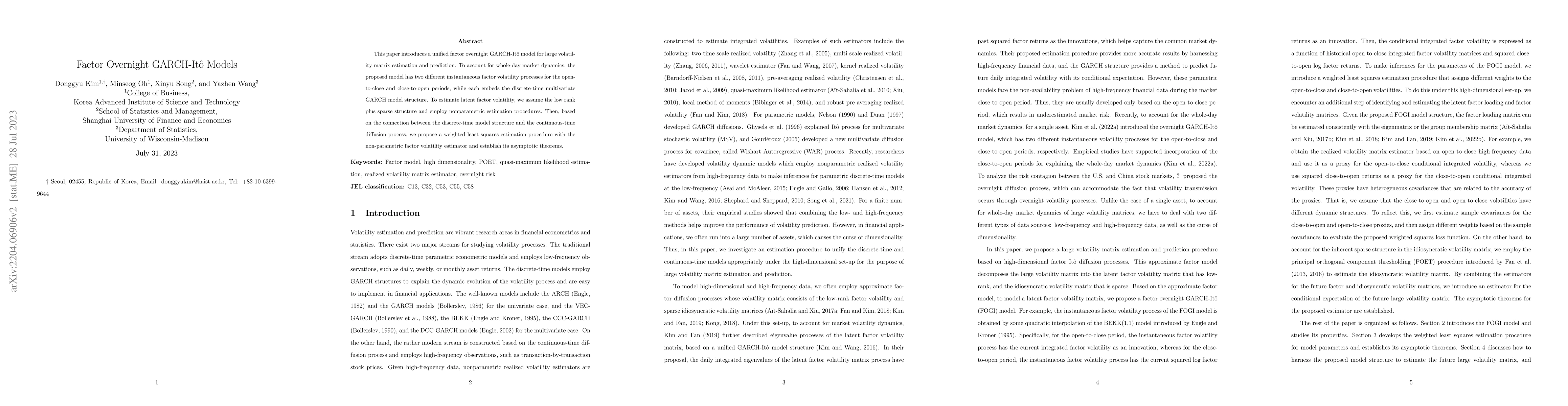 This paper proposes a unified factor overnight GARCH-Itô model for estimating and predicting large volatility matrices, incorporating separate instantaneous factor volatility processes for open-to-close and close-to-open periods, and employs nonparametric estimation to handle the low rank plus sparse structure. The model uses a weighted least squares procedure for estimation, supported by asymptotic theorems.