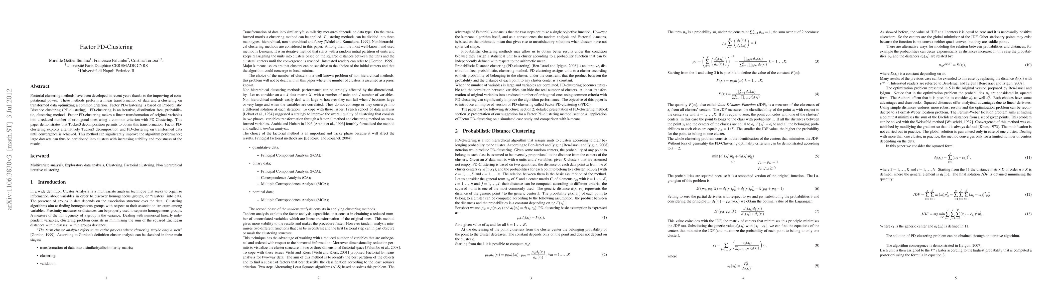 Factorial clustering methods have been developed in recent years thanks to the improving of computational power. These methods perform a linear transformation of data and a clustering on transformed data optimizing a common criterion. Factorial PD-clustering is based on Probabilistic Distance clustering (PD-clustering). PD-clustering is an iterative, distribution free, probabilistic, clustering method. Factor PD-clustering make a linear transformation of original variables into a reduced number of orthogonal ones using a common criterion with PD-Clustering. It is demonstrated that Tucker 3 decomposition allows to obtain this transformation. Factor PD-clustering makes alternatively a Tucker 3 decomposition and a PD-clustering on transformed data until convergence. This method could significantly improve the algorithm performance and allows to work with large dataset, to improve the stability and the robustness of the method.