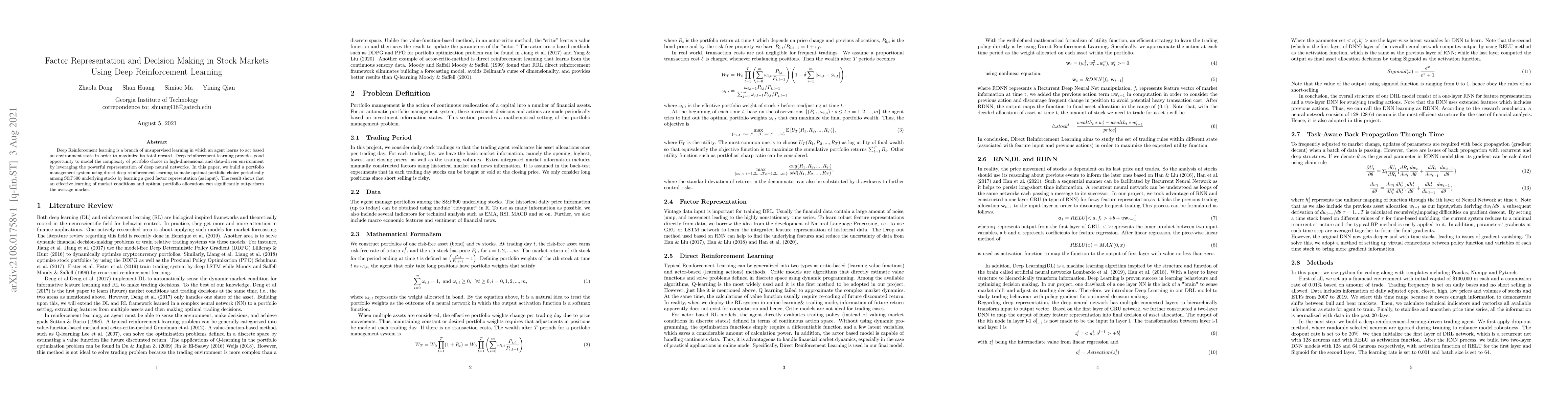 Deep Reinforcement learning is a branch of unsupervised learning in which an agent learns to act based on environment state in order to maximize its total reward. Deep reinforcement learning provides good opportunity to model the complexity of portfolio choice in high-dimensional and data-driven environment by leveraging the powerful representation of deep neural networks. In this paper, we build a portfolio management system using direct deep reinforcement learning to make optimal portfolio choice periodically among S\&P500 underlying stocks by learning a good factor representation (as input). The result shows that an effective learning of market conditions and optimal portfolio allocations can significantly outperform the average market.