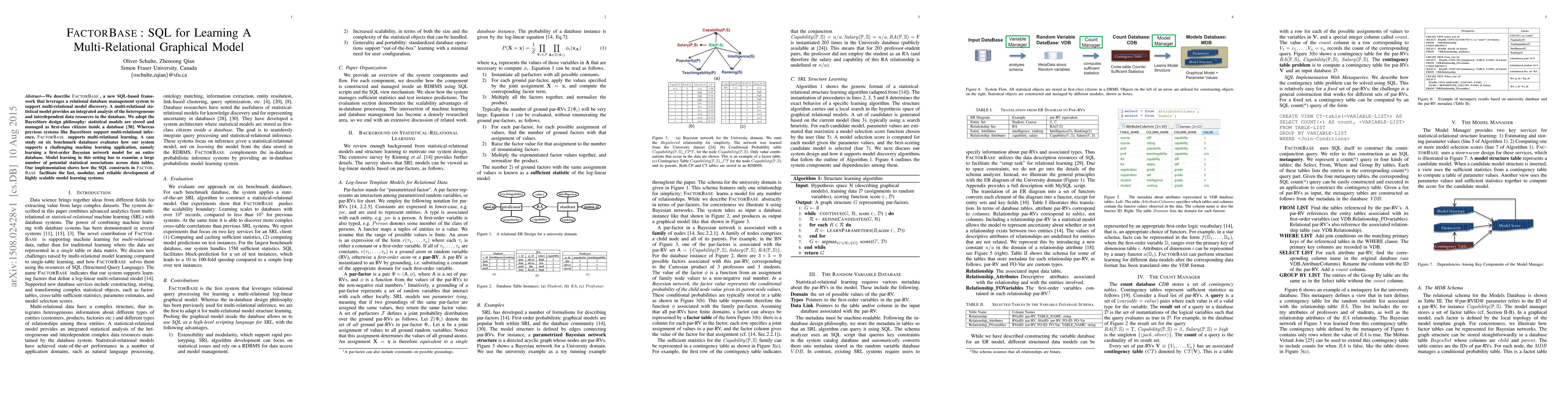 We describe FactorBase, a new SQL-based framework that leverages a relational database management system to support multi-relational model discovery. A multi-relational statistical model provides an integrated analysis of the heterogeneous and interdependent data resources in the database. We adopt the BayesStore design philosophy: statistical models are stored and managed as first-class citizens inside a database. Whereas previous systems like BayesStore support multi-relational inference, FactorBase supports multi-relational learning. A case study on six benchmark databases evaluates how our system supports a challenging machine learning application, namely learning a first-order Bayesian network model for an entire database. Model learning in this setting has to examine a large number of potential statistical associations across data tables. Our implementation shows how the SQL constructs in FactorBase facilitate the fast, modular, and reliable development of highly scalable model learning systems.