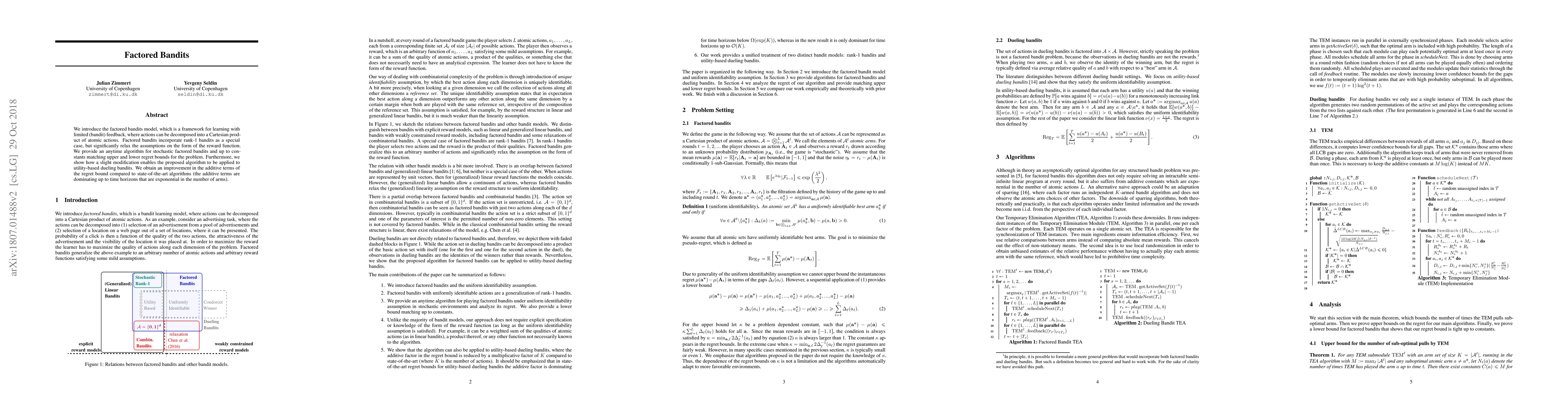 Researchers introduced a new framework for learning with limited feedback called factored bandits, which allows for decomposing actions into atomic components and provides an anytime algorithm with improved regret bounds compared to existing state-of-the-art algorithms.