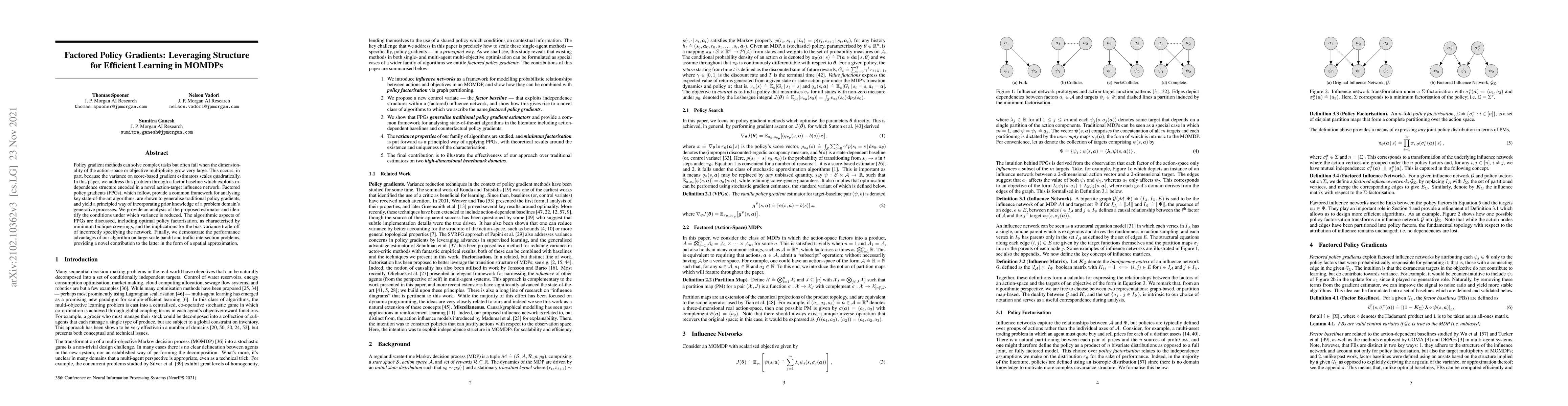 This paper introduces factored policy gradients, a method to improve learning in complex tasks with large action spaces, by leveraging structure in the problem domain. It demonstrates performance advantages on large-scale bandit and traffic intersection problems.