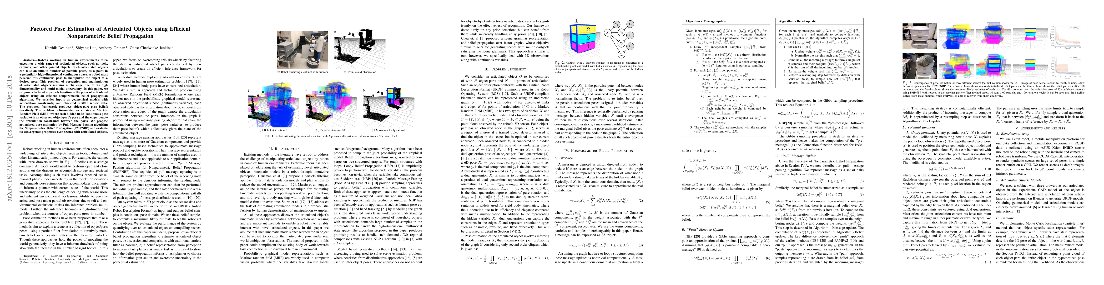 This paper proposes a factored approach using nonparametric belief propagation to estimate the poses of articulated objects, addressing the challenge of high dimensionality and multi-modal uncertainty. The method iteratively computes object-part pose beliefs through a pairwise Markov Random Field, employing a Pull Message Passing algorithm for efficient computation.