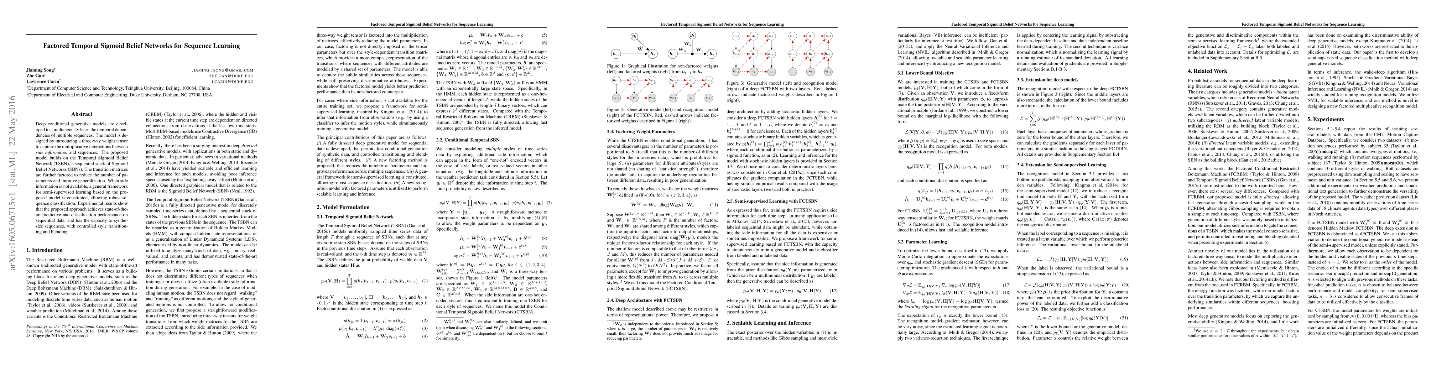 The paper proposes a Factored Temporal Sigmoid Belief Network (FTSBN) for learning temporal dependencies in multiple sequences, utilizing a three-way weight tensor and factored transition matrices for parameter reduction. The model achieves state-of-the-art performance on sequence classification and sequence generation tasks.