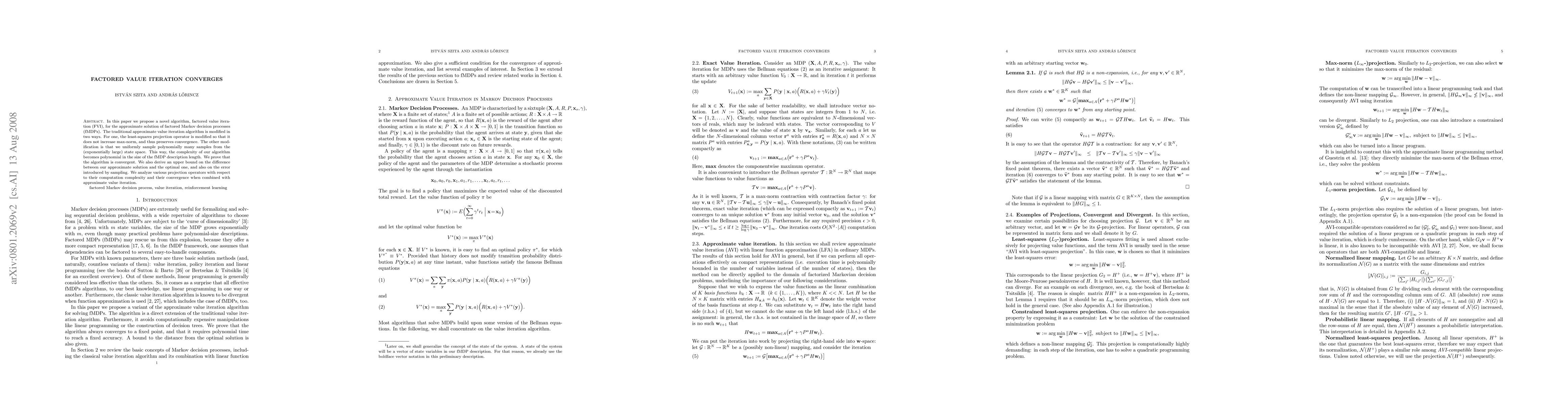 This paper introduces factored value iteration (FVI), a novel algorithm for solving factored Markov decision processes (fMDPs) by modifying traditional approximate value iteration to ensure convergence and reduce complexity. The algorithm samples a polynomially manageable subset of the state space, proving its convergence and providing bounds on approximation and sampling errors.