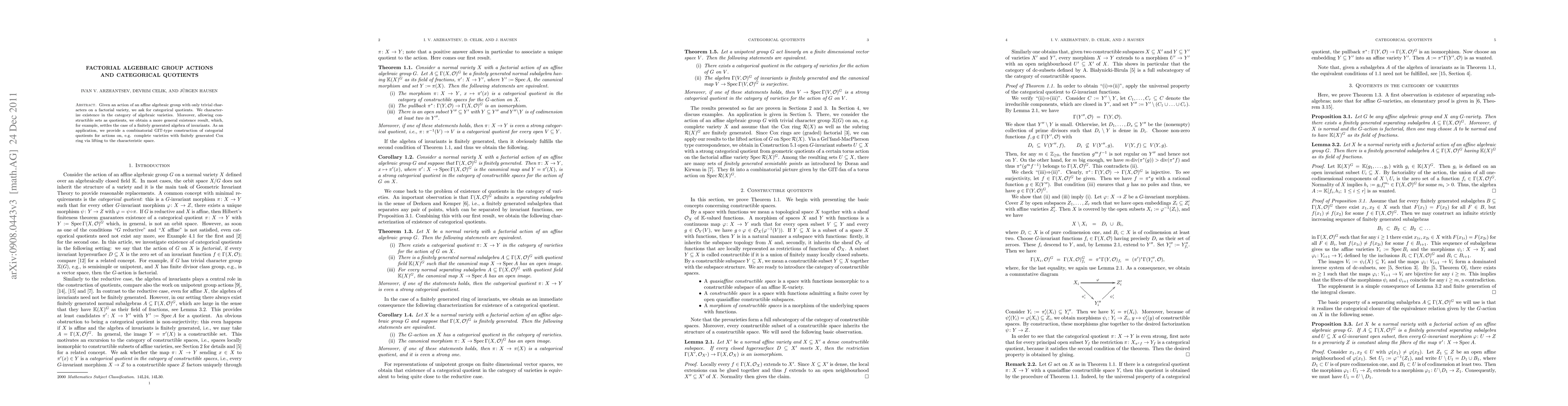 This paper studies the categorical quotients for actions of affine algebraic groups on factorial varieties, characterizing their existence within algebraic varieties and constructible sets. It provides a combinatorial construction for categorical quotients, applicable to complete varieties with finitely generated Cox rings.