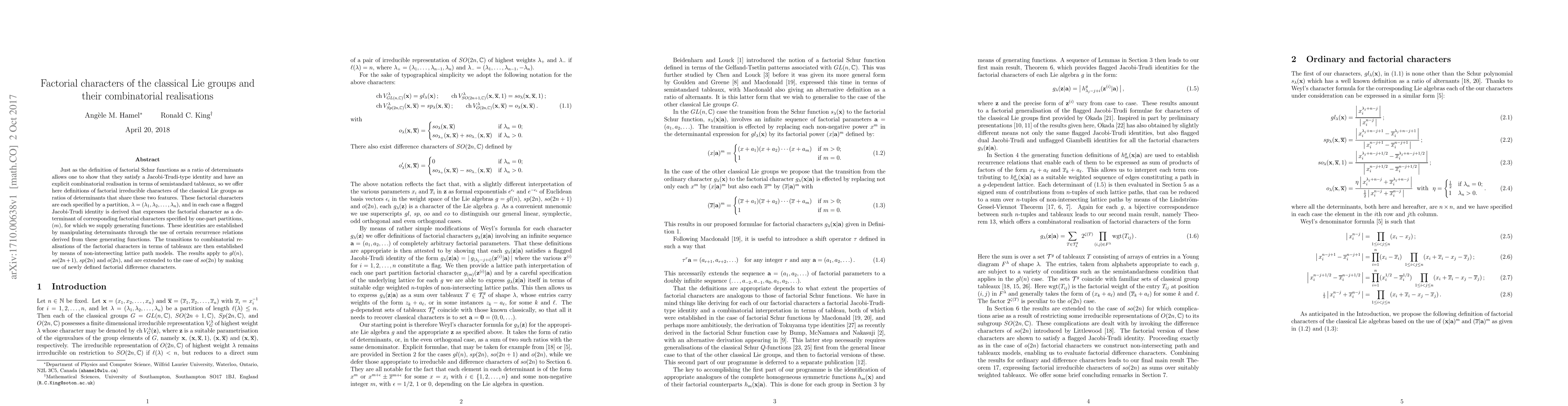 Just as the definition of factorial Schur functions as a ratio of determinants allows one to show that they satisfy a Jacobi-Trudi-type identity and have an explicit combinatorial realisation in terms of semistandard tableaux, so we offer here definitions of factorial irreducible characters of the classical Lie groups as ratios of determinants that share these two features. These factorial characters are each specified by a partition, $\lambda=(\lambda_1,\lambda_2,\ldots,\lambda_n)$, and in each case a flagged Jacobi-Trudi identity is derived that expresses the factorial character as a determinant of corresponding factorial characters specified by one-part partitions, $(m)$, for which we supply generating functions. These identities are established by manipulating determinants through the use of certain recurrence relations derived from these generating functions. The transitions to combinatorial realisations of the factorial characters in terms of tableaux are then established by means of non-intersecting lattice path models. The results apply to $gl(n)$, $so(2n+1)$, $sp(2n)$ and $o(2n)$, and are extended to the case of $so(2n)$ by making use of newly defined factorial difference characters.