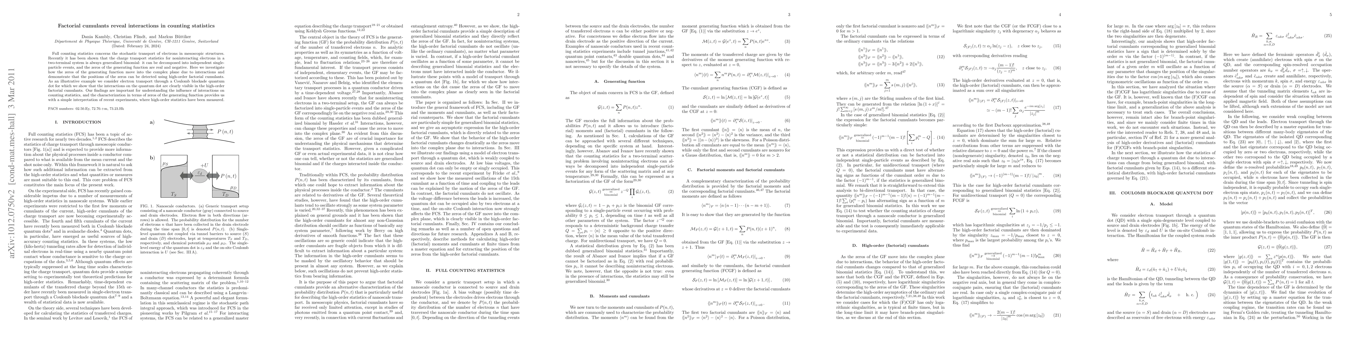 This paper investigates how interactions alter the zeros of the generating function in electron transport statistics through mesoscopic structures, revealing these changes via high-order factorial cumulants. The study demonstrates this effect using a Coulomb blockade quantum dot, highlighting the significance of interactions in counting statistics.