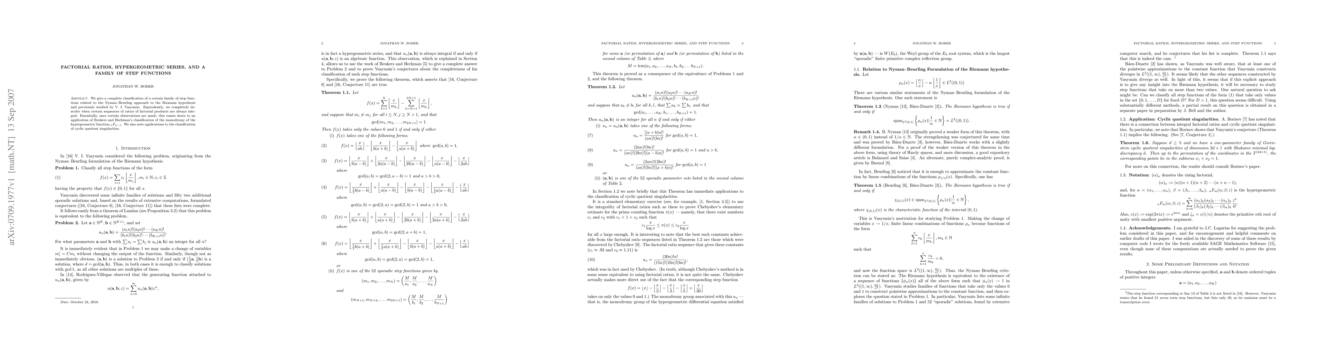 We give a complete classification of a certain family of step functions related to the Nyman--Beurling approach to the Riemann hypothesis and previously studied by V. I. Vasyunin. Equivalently, we completely describe when certain sequences of ratios of factorial products are always integral. Essentially, once certain observations are made, this comes down to an application of Beukers and Heckman's classification of the monodromy of the hypergeometric function nF_{n-1}. We also note applications to the classification of cyclic quotient singularities.