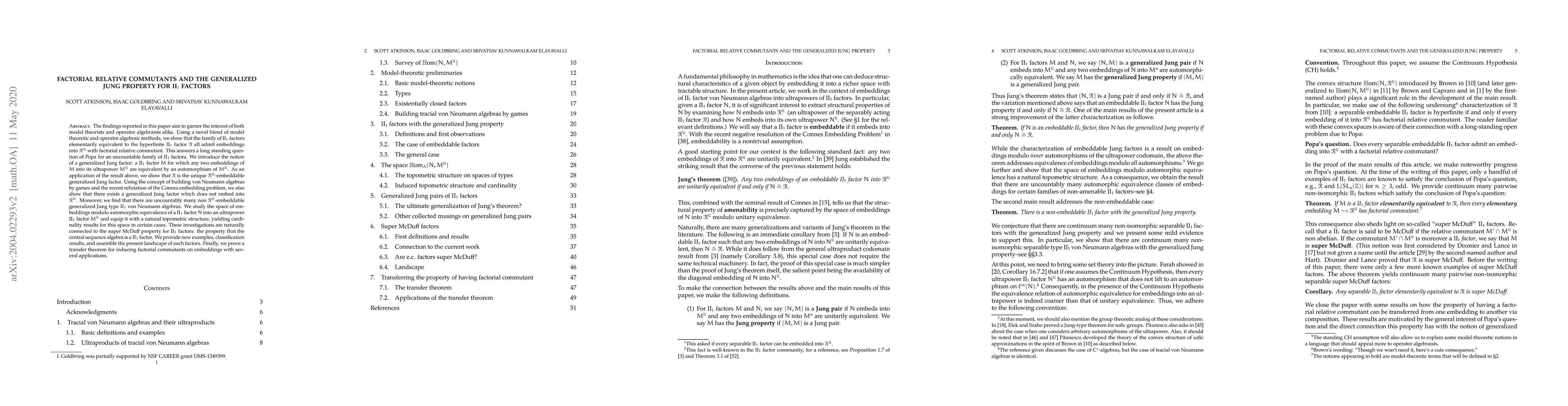 We introduce the notion of a generalized Jung factor: a II$_1$ factor $M$ for which any two embeddings of $M$ into its ultrapower $M^{\mathcal U}$ are equivalent by an automorphism of $M^{\mathcal U}$. We show that $\mathcal R$ is not the unique generalized Jung factor but is the unique $\mathcal R^{\mathcal U}$-embeddable generalized Jung factor. We use model-theoretic techniques to obtain these results. Integral to the techniques used is the result that if $M$ is elementarily equivalent to $\mathcal R$, then any elementary embedding of $M$ into $\mathcal R^{\mathcal U}$ has factorial relative commutant. This answers a long-standing question of Popa for an uncountable family of II$_1$ factors. We also provide new examples and results about the notion of super McDuffness, which is a strengthening of the McDuff property for II$_1$ factors.