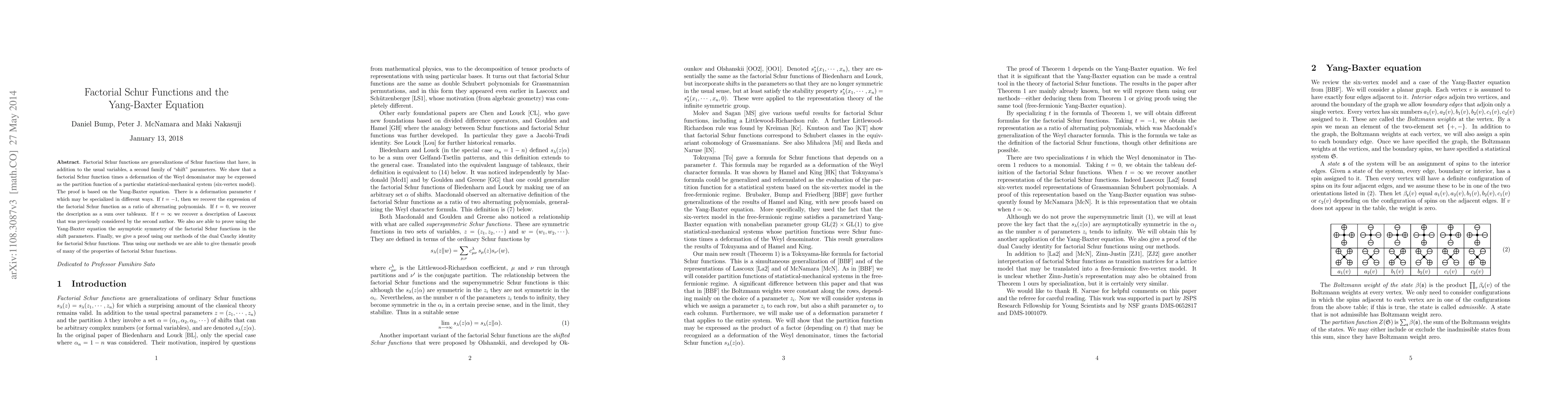 This paper explores factorial Schur functions, showing their equivalence to the partition function of the six vertex model via a deformation of the Weyl denominator, grounded in the Yang-Baxter equation. It also demonstrates the asymptotic symmetry and dual Cauchy identity for these functions through this framework.