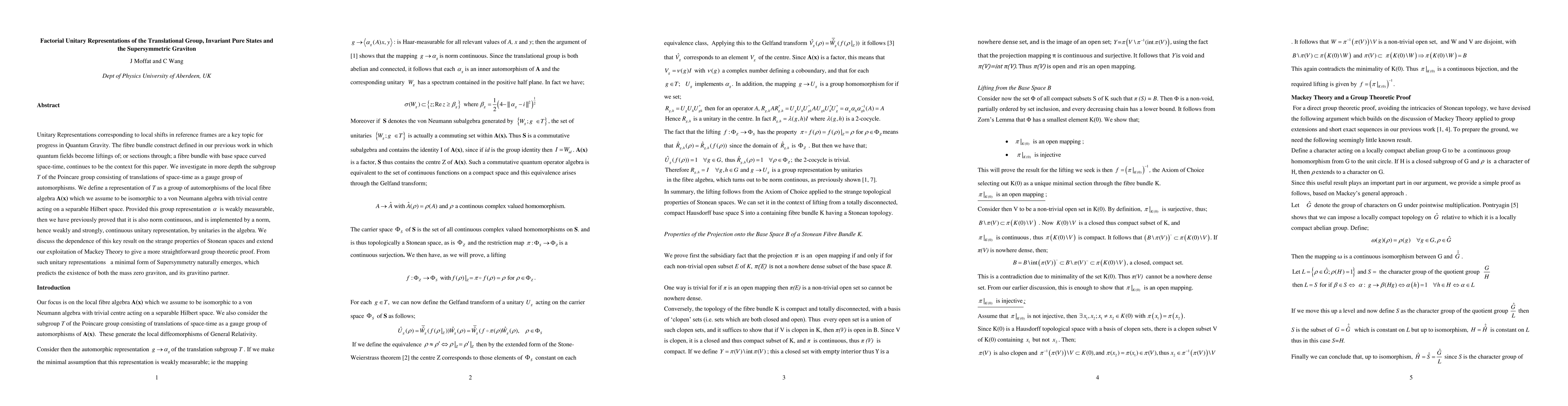 Unitary Representations corresponding to local shifts in reference frames are a key topic for progress in Quantum Gravity. The fibre bundle construct defined in our previous work in which quantum fields become liftings of; or sections through; a fibre bundle with base space curved space-time, continues to be the context for this paper. We investigate in more depth the subgroup T of the Poincare group consisting of translations of space-time as a gauge group of automorphisms. We define to be a representation of T as such automorphisms of the local fibre algebra A(x) which we assume to be isomorphic to a von Neumann algebra with trivial centre acting on a separable Hilbert space. Provided this group representation is weakly measurable, then we have previously proved that it is also norm continuous, and is implemented by a norm, hence weakly and strongly, continuous unitary representation. We discuss the dependence of this key result on the strange properties of Stonean spaces and extend our exploitation of Mackey Theory to give a more straightforward group theoretic proof. From such unitary representations a minimal form of Supersymmetry naturally emerges, which predicts the existence of both the mass zero graviton, and its gravitino partner.