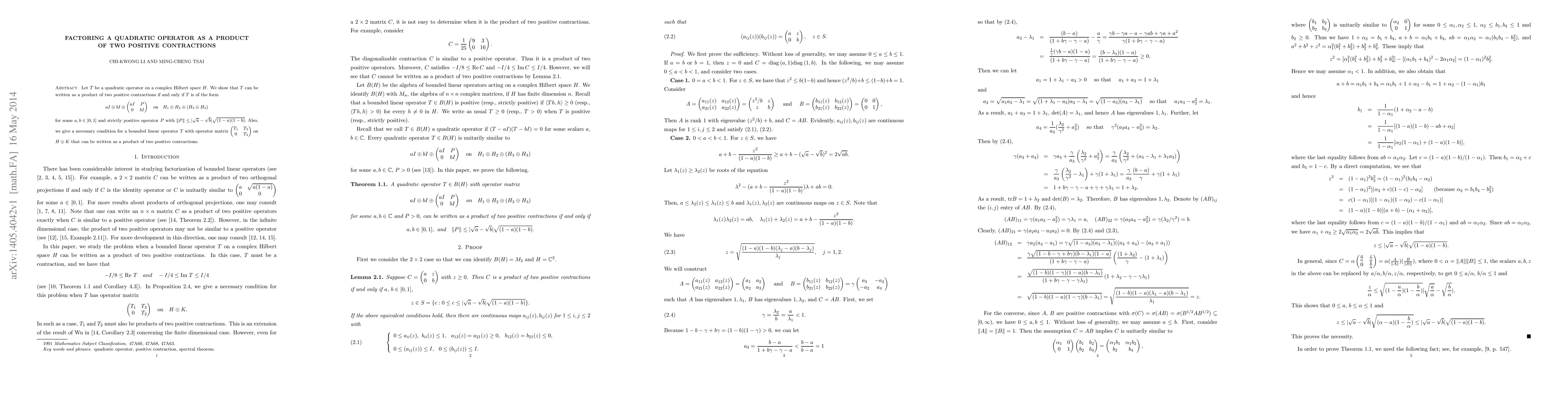 Let $T$ be a quadratic operator on a complex Hilbert space $H$. We show that $T$ can be written as a product of two positive contractions if and only if $T$ is of the form $$aI \oplus bI \oplus\begin{pmatrix} aI & P \cr 0 & bI \cr \end{pmatrix} \quad \text{on} \quad H_1\oplus H_2\oplus (H_3\oplus H_3)$$ for some $a, b\in [0,1]$ and strictly positive operator $P$ with $\|P\| \le |\sqrt{a} - \sqrt{b}|\sqrt{(1-a)(1-b)}.$ Also, we give a necessary condition for a bounded linear operator $T$ with operator matrix $\begin{pmatrix} T_1 & T_3\\ 0 & T_2\cr\end{pmatrix}$ on $H\oplus K$ that can be written as a product of two positive contractions.