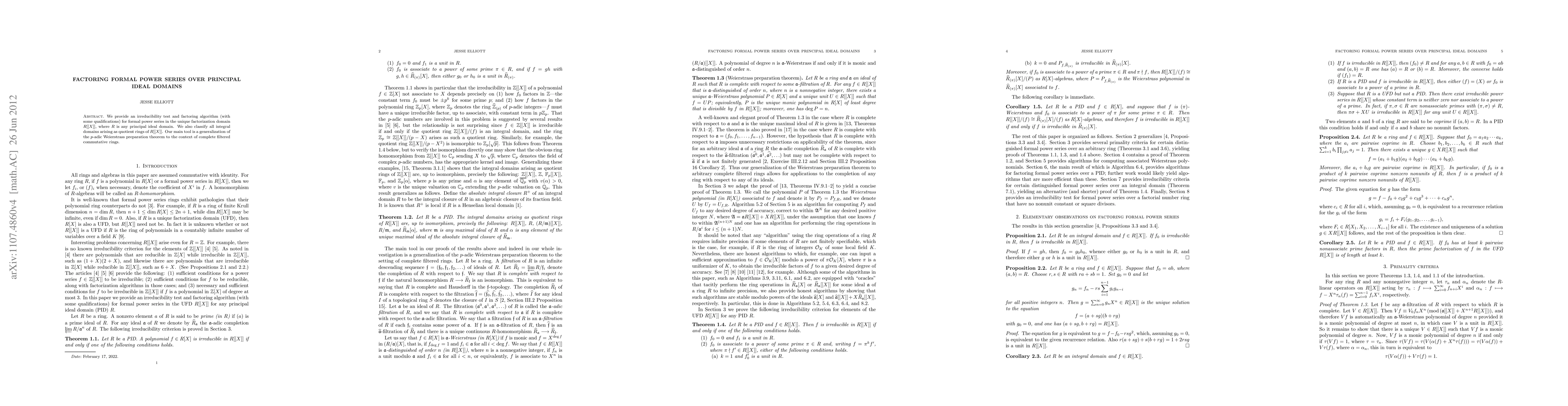 We provide an irreducibility test and factoring algorithm (with some qualifications) for formal power series in the unique factorization domain $R[[X]]$, where $R$ is any principal ideal domain. We also classify all integral domains arising as quotient rings of $R[[X]]$. Our main tool is a generalization of the $p$-adic Weierstrass preparation theorem to the context of complete filtered commutative rings.