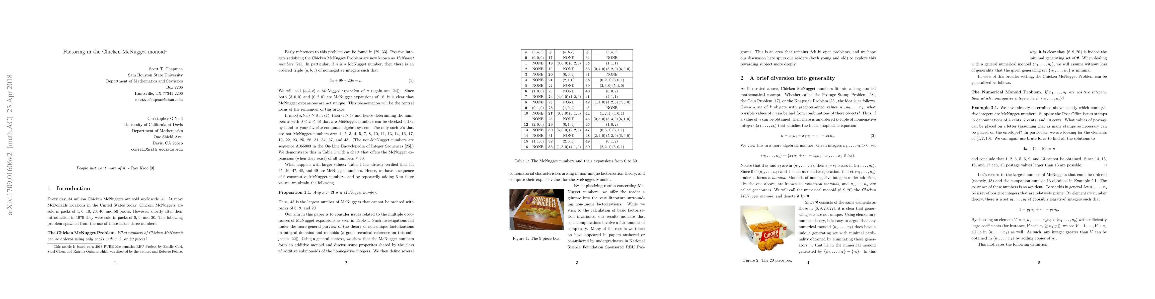 This paper introduces the Chicken McNugget problem, exploring the numbers that can be formed using packs of 6, 9, or 20 pieces, and connects it to the theory of non-unique factorization, also known as the monoid structure in algebraic contexts.