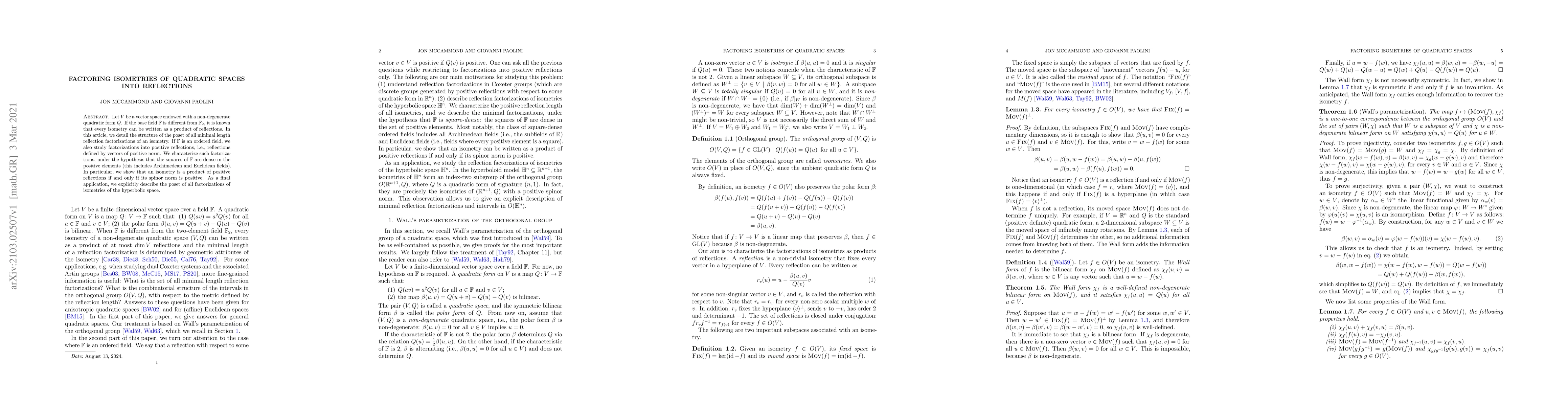 This paper studies the structure of reflection factorizations for isometries in quadratic spaces, focusing on minimal length factorizations and positive reflections, with implications for hyperbolic space geometry.