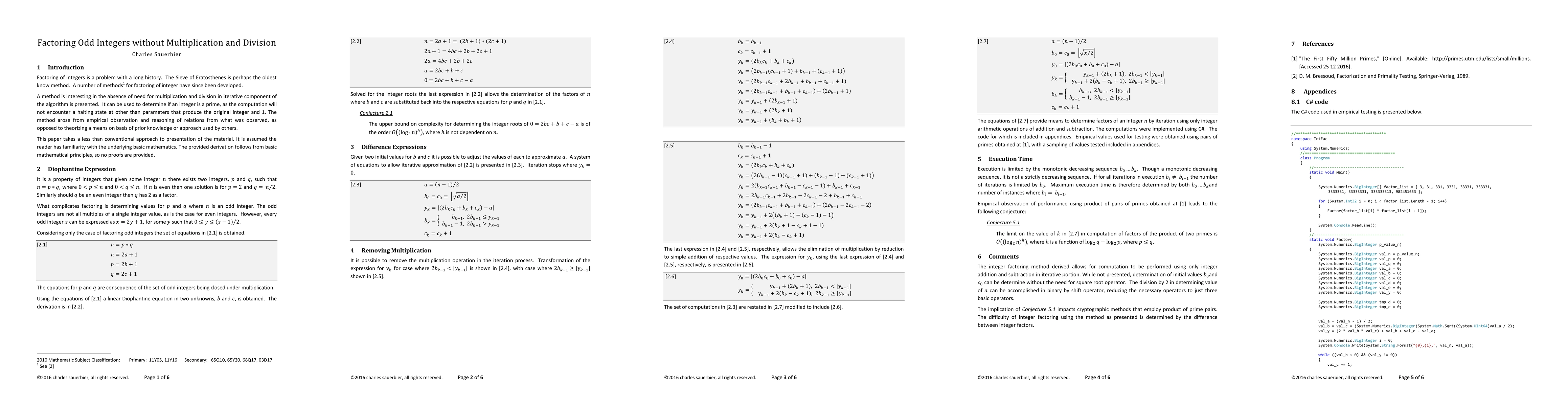 A method of determining two factors of an odd integer without need of multiplication or division operation in iterative portion of computation is presented. It is feasible for an implementing algorithm to use only integer addition and subtraction throughout. Presentation of material is non-theoretical; intended to be accessible to a broader audience of non academic and theoretical practitioners.