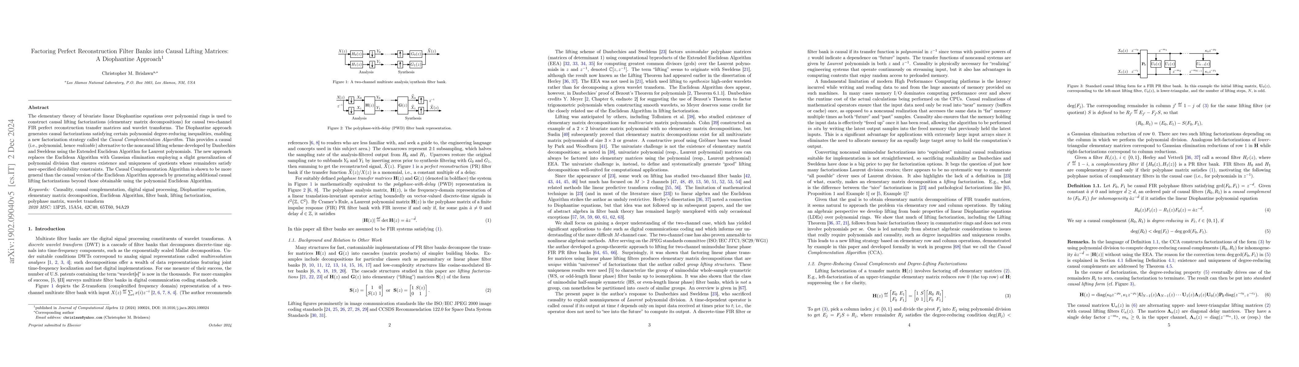 The paper presents a Diophantine approach to construct causal lifting factorizations for perfect reconstruction filter banks and wavelet transforms, introducing the Causal Complementation Algorithm. This method provides a causal alternative to Daubechies and Sweldens' noncausal lifting scheme, offering more factorizations than the polynomial Euclidean Algorithm.
