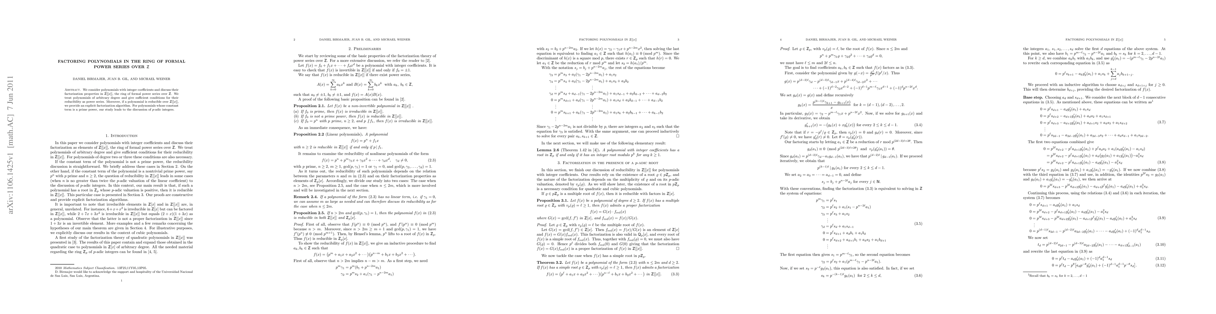 This paper explores the factorization of integer coefficient polynomials in the ring of formal power series over Z, presenting conditions for their reducibility and an algorithm for explicit factorization. It also discusses the relevance of p-adic integers for polynomials with prime power constant terms.