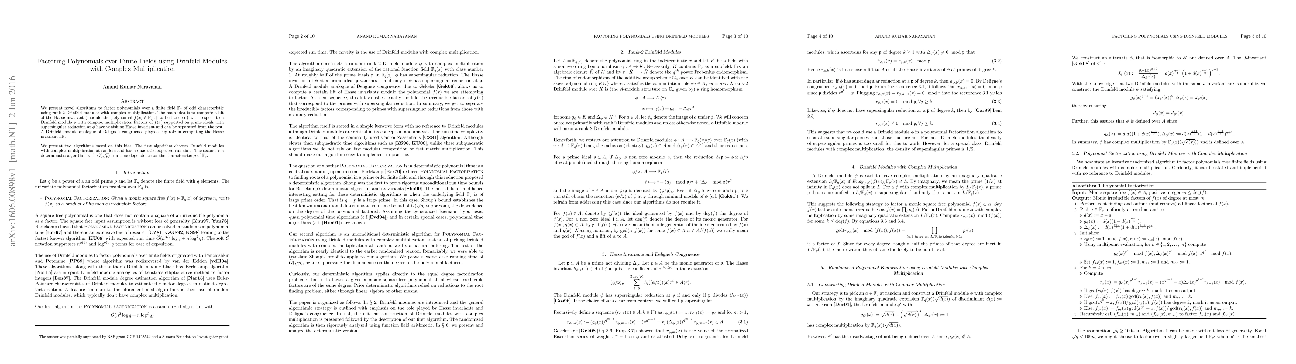 We present novel algorithms to factor polynomials over a finite field $\F_q$ of odd characteristic using rank $2$ Drinfeld modules with complex multiplication. The main idea is to compute a lift of the Hasse invariant (modulo the polynomial $f(x) \in \F_q[x]$ to be factored) with respect to a Drinfeld module $\phi$ with complex multiplication. Factors of $f(x)$ supported on prime ideals with supersingular reduction at $\phi$ have vanishing Hasse invariant and can be separated from the rest. A Drinfeld module analogue of Deligne's congruence plays a key role in computing the Hasse invariant lift. We present two algorithms based on this idea. The first algorithm chooses Drinfeld modules with complex multiplication at random and has a quadratic expected run time. The second is a deterministic algorithm with $O(\sqrt{p})$ run time dependence on the characteristic $p$ of $\F_q$.