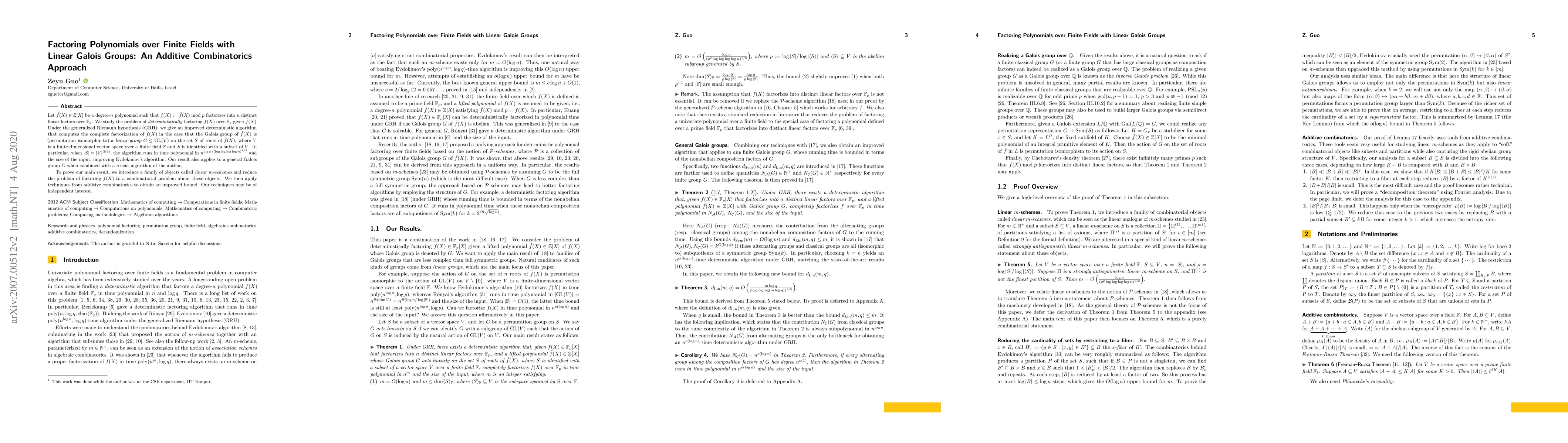 Let $\tilde{f}(X)\in\mathbb{Z}[X]$ be a degree-$n$ polynomial such that $f(X):=\tilde{f}(X)\bmod p$ factorizes into $n$ distinct linear factors over $\mathbb{F}_p$. We study the problem of deterministically factoring $f(X)$ over $\mathbb{F}_p$ given $\tilde{f}(X)$. Under the generalized Riemann hypothesis (GRH), we give an improved deterministic algorithm that computes the complete factorization of $f(X)$ in the case that the Galois group of $\tilde{f}(X)$ is (permutation isomorphic to) a linear group $G\leq \mathrm{GL}(V)$ on the set $S$ of roots of $\tilde{f}(X)$, where $V$ is a finite-dimensional vector space over a finite field $\mathbb{F}$ and $S$ is identified with a subset of $V$. In particular, when $|S|=|V|^{\Omega(1)}$, the algorithm runs in time polynomial in $n^{\log n/(\log\log\log\log n)^{1/3}}$ and the size of the input, improving Evdokimov's algorithm. Our result also applies to a general Galois group $G$ when combined with a recent algorithm of the author. To prove our main result, we introduce a family of objects called linear $m$-schemes and reduce the problem of factoring $f(X)$ to a combinatorial problem about these objects. We then apply techniques from additive combinatorics to obtain an improved bound. Our techniques may be of independent interest.