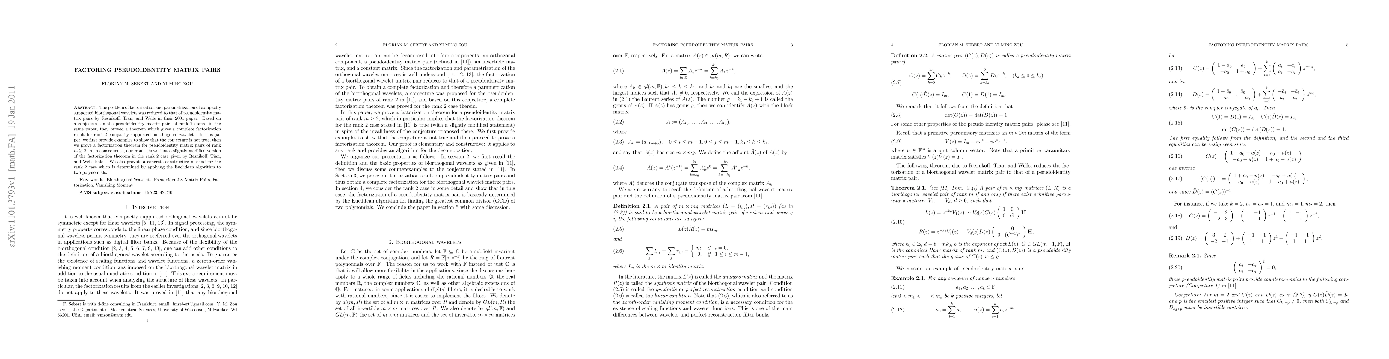 The problem of factorization and parametrization of compactly supported biorthogonal wavelets was reduced to that of pseudoidentity matrix pairs by Resnikoff, Tian, and Wells in their 2001 paper. Based on a conjecture on the pseudoidentity matrix pairs of rank 2 stated in the same paper, they proved a theorem which gives a complete factorization result for rank 2 compactly supported biorthogonal wavelets. In this paper, we first provide examples to show that the conjecture is not true, then we prove a factorization theorem for pseudoidentity matrix pairs of rank $m\ge 2$. As a consequence, our result shows that a slightly modified version of the factorization theorem in the rank 2 case given by Resnikoff, Tian, and Wells holds. We also provide a concrete constructive method for the rank 2 case which is determined by applying the Euclidean algorithm to two polynomials.