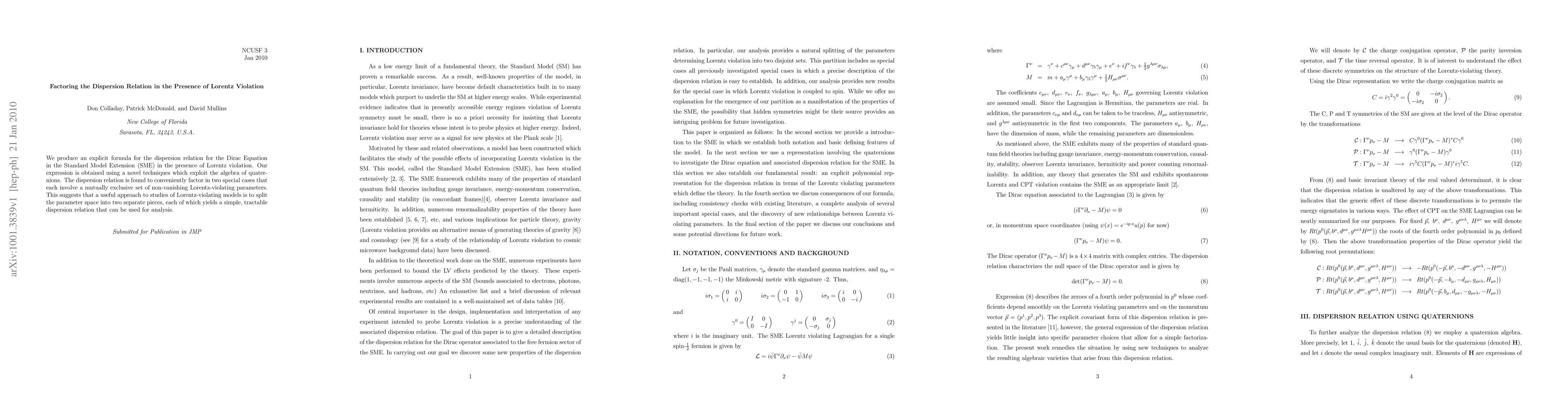 We produce an explicit formula for the dispersion relation for the Dirac Equation in the Standard Model Extension (SME) in the presence of Lorentz violation. Our expression is obtained using a novel techniques which exploit the algebra of quaternions. The dispersion relation is found to conveniently factor in two special cases that each involve a mutually exclusive set of non-vanishing Lorentz-violating parameters. This suggests that a useful approach to studies of Lorentz-violating models is to split the parameter space into two separate pieces, each of which yields a simple, tractable dispersion relation that can be used for analysis.