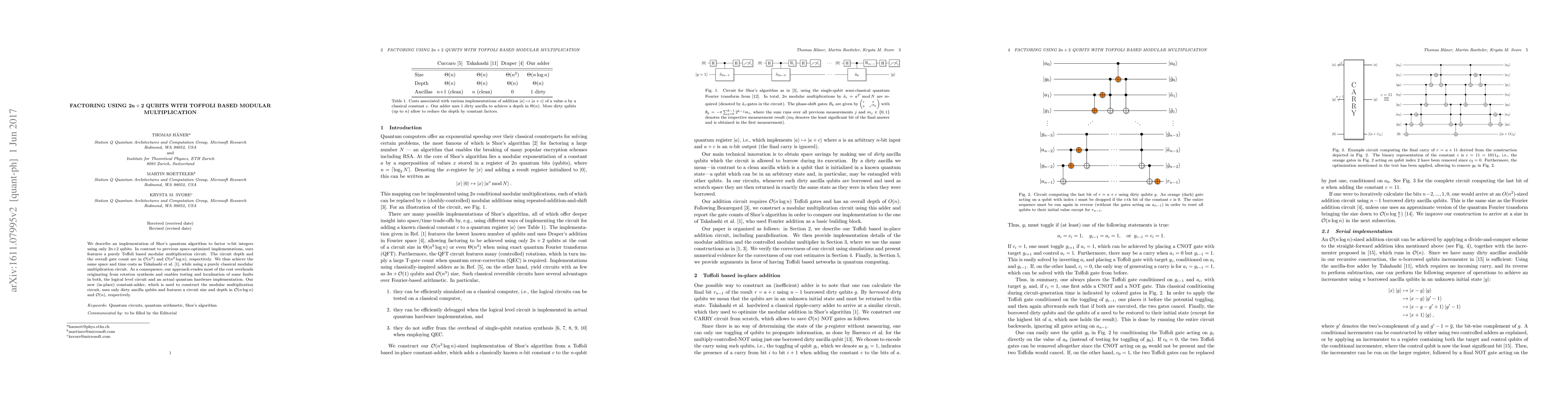 We describe an implementation of Shor's quantum algorithm to factor n-bit integers using only 2n+2 qubits. In contrast to previous space-optimized implementations, ours features a purely Toffoli based modular multiplication circuit. The circuit depth and the overall gate count are in O(n^3) and O(n^3 log(n)), respectively. We thus achieve the same space and time costs as Takahashi et al., while using a purely classical modular multiplication circuit. As a consequence, our approach evades most of the cost overheads originating from rotation synthesis and enables testing and localization of faults in both, the logical level circuit and an actual quantum hardware implementation. Our new (in-place) constant-adder, which is used to construct the modular multiplication circuit, uses only dirty ancilla qubits and features a circuit size and depth in O(n log(n)) and O(n), respectively.