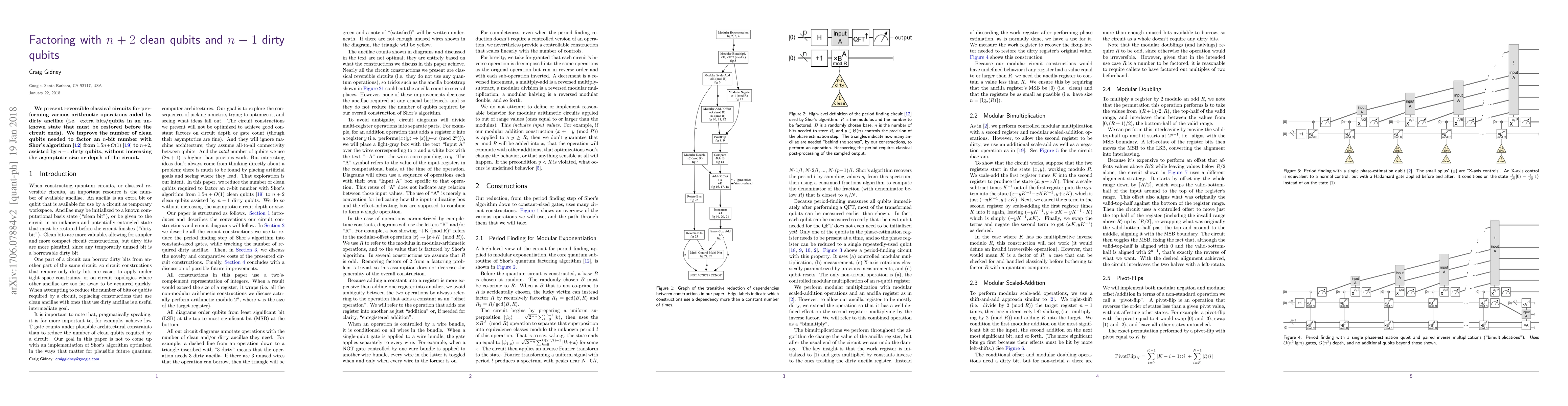 Researchers developed reversible classical circuits to factor large numbers using Shor's algorithm with improved efficiency, reducing the number of clean qubits needed from 1.5n+O(1) to n+2.
