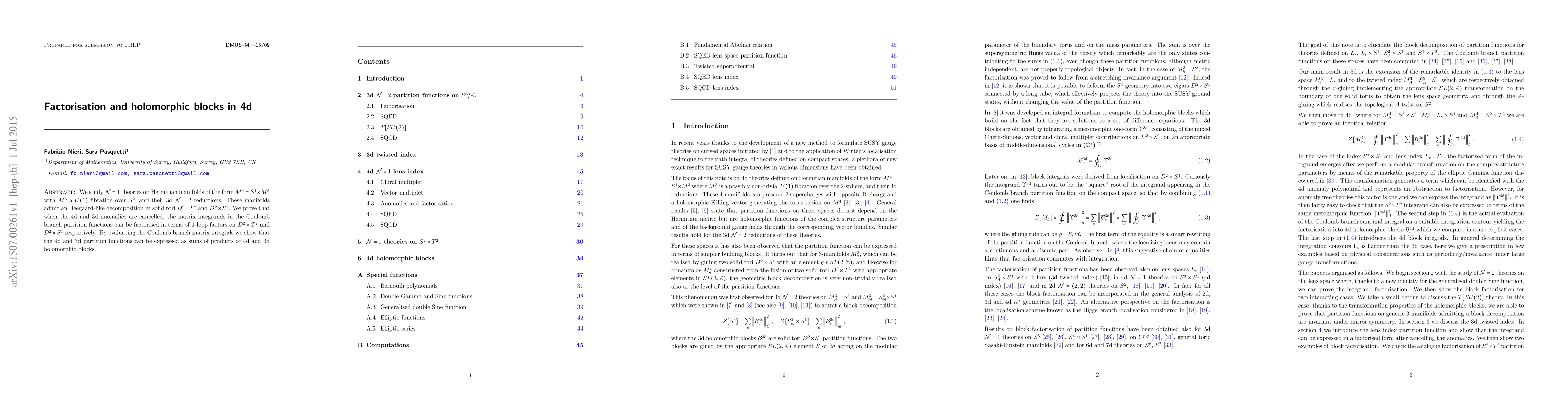 This paper investigates N=1 theories on specific Hermitian manifolds and their 3d N=2 reductions, demonstrating that when anomalies are cancelled, the partition functions can be factorised and expressed as sums of holomorphic blocks, revealing a deep connection between 4d and 3d theories.