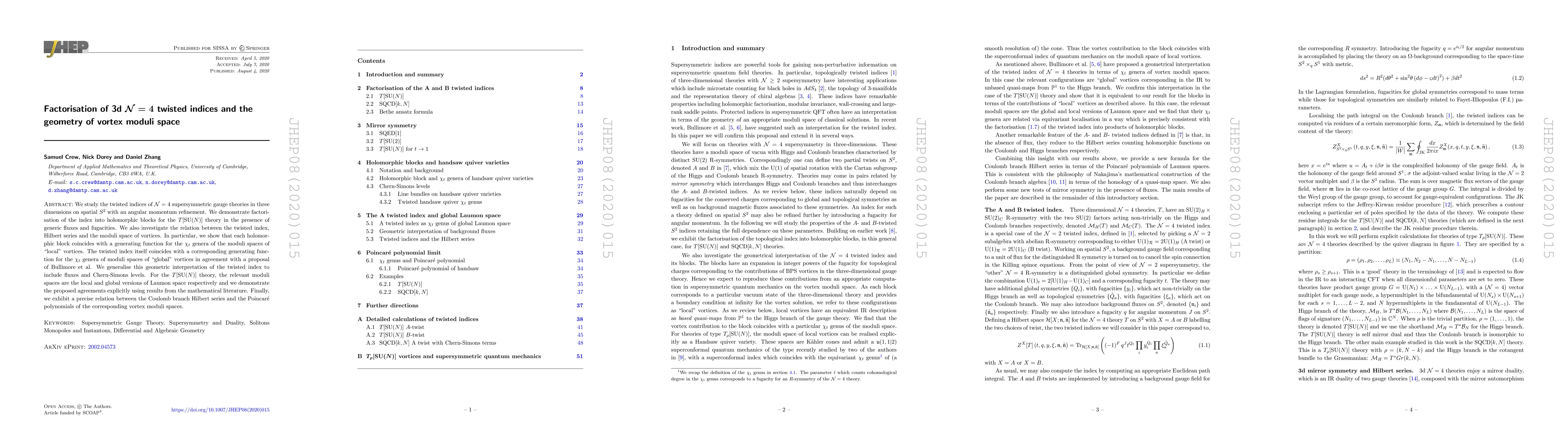 We study the twisted indices of $\mathcal{N}=4$ supersymmetric gauge theories in three dimensions on spatial $S^{2}$ with an angular momentum refinement. We demonstrate factorisation of the index into holomorphic blocks for the $T[SU(N)]$ theory in the presence of generic fluxes and fugacities. We also investigate the relation between the twisted index, Hilbert series and the moduli space of vortices. In particular, we show that each holomorphic block coincides with a generating function for the $\chi_{t}$ genera of the moduli spaces of "local" vortices. The twisted index itself coincides with a corresponding generating function for the $\chi_{t}$ genera of moduli spaces of "global" vortices in agreement with a proposal of Bullimore et. al. We generalise this geometric interpretation of the twisted index to include fluxes and Chern-Simons levels. For the $T[SU(N)]$ theory, the relevant moduli spaces are the local and global versions of Laumon space respectively and we demonstrate the proposed agreements explicitly using results from the mathematical literature. Finally, we exhibit a precise relation between the Coulomb branch Hilbert series and the Poincar\'e polynomials of the corresponding vortex moduli spaces.