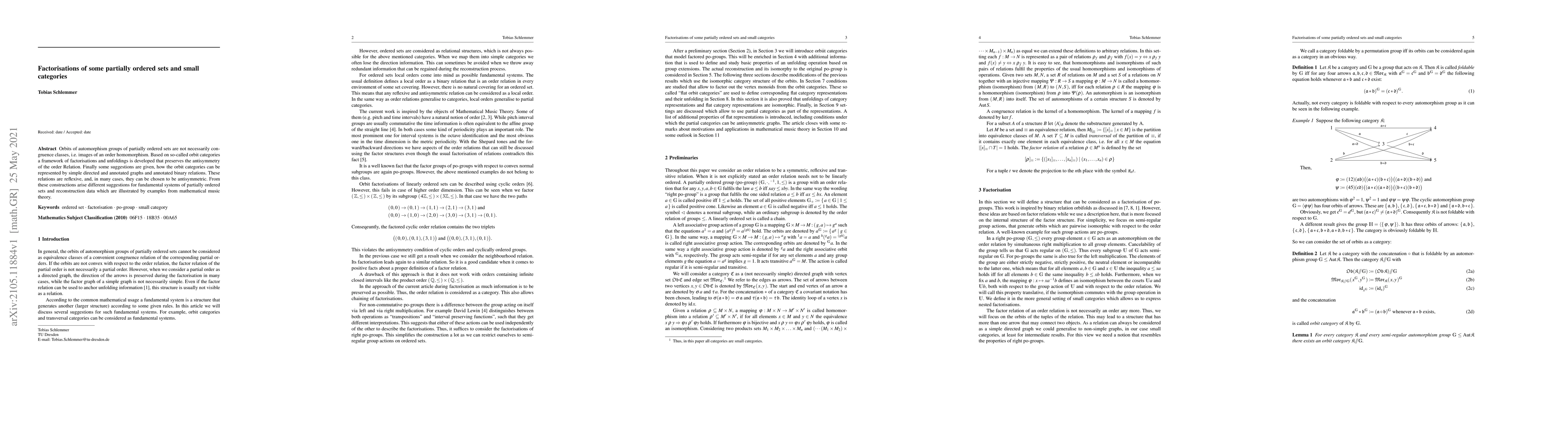 The paper develops a framework for factorizations and unfoldings of partially ordered sets based on orbit categories, preserving antisymmetry, and represents them via directed graphs and annotated binary relations. It also explores applications in mathematical music theory for constructing fundamental systems and reconstruction data.