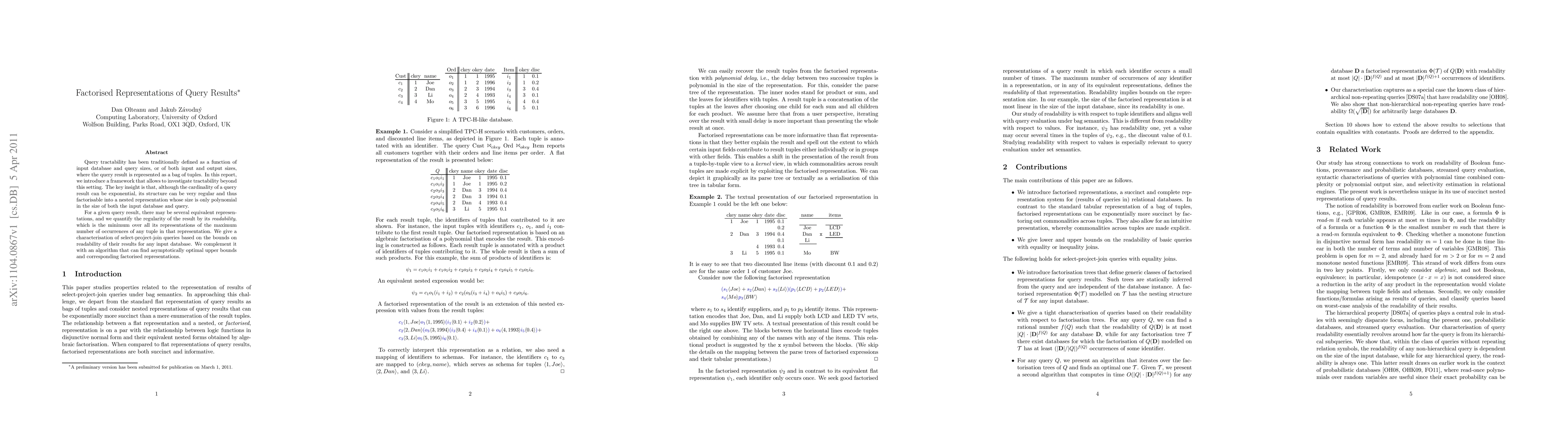 This paper explores query tractability through factorised representations of query results, showing that even exponentially large results can have polynomial-sized, nested representations. It introduces a measure of readability to quantify the regularity of query results and provides an algorithm to find optimal bounds and corresponding representations for select-project-join queries.